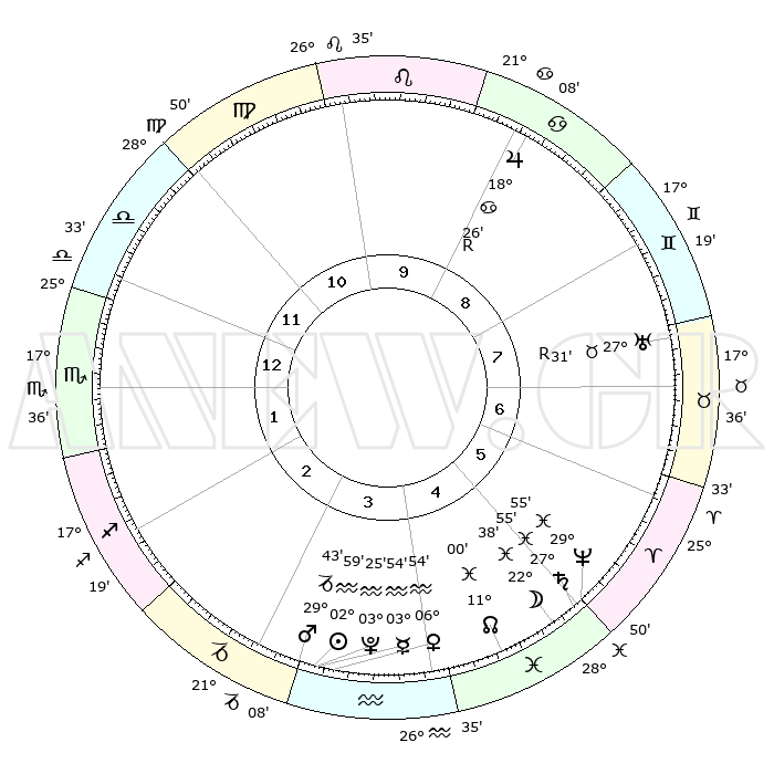 | | ΘΕΣΕΙΣ ΠΛΑΝΗΤΩΝ ΑΣΤΡΟΛΟΓΙΚΟΥ ΧΑΡΤΗ ΤΗΣ ΣΤΙΓΜΗΣ ΑΥΤΗΣ | | | | Πλανήτης | Ζώδιο | Μοίρες | Δεκαήμ. | Σε οίκο | Απόκλιση | | Ακμές των οίκων | | Ηλιος | Υδροχόος | 02°55' | Πρώτο | 4 | 19 S 30 | | 1ος | 26°27' | Ζυγός | | Σελήνη | Ιχθείς | 21°40' | Τρίτο | 5 | 02 S 17 | | 2ος | 24°39' | Σκορπιός | | Ερμής | Υδροχόος | 03°47' | Πρώτο | 4 | 21 S 19 | | 3ος | 26°20' | Τοξότης | | Αφροδίτη | Υδροχόος | 06°48' | Πρώτο | 4 | 19 S 43 | | 4ος | 00°18' | Υδροχόος | | Αρης | Αιγόκερως | 29°39' | Τρίτο | 3 | 21 S 12 | | 5ος | 03°15' | Ιχθείς | | Δίας | Καρκίνος | 18°26'R | Δεύτερο | 9 | 22 N 27 | | 6ος | 02°13' | Κριός | | Κρόνος | Ιχθείς | 27°54' | Τρίτο | 5 | 02 S 51 | | 7ος | 26°27' | Κριός | | Ουρανός | Ταύρος | 27°31'R | Τρίτο | 8 | 19 N 25 | | 8ος | 24°39' | Ταύρος | | Ποσειδώνας | Ιχθείς | 29°55' | Τρίτο | 5 | 01 S 15 | | 9ος | 26°20' | Δίδυμοι | | Πλούτωνας | Υδροχόος | 03°25' | Πρώτο | 4 | 23 S 05 | | 10ος | 00°18' | Λέων | | Β. Δεσμός | Ιχθείς | 11°00' | Δεύτερο | 5 | 07 S 26 | | 11ος | 03°15' | Παρθένος | | Ωροσκόπος | Ζυγός | 26°27' | Τρίτο | | | 12ος | 02°13' | Ζυγός | | Μεσουράνημα | Λέων | 00°18' | Πρώτο | | | |