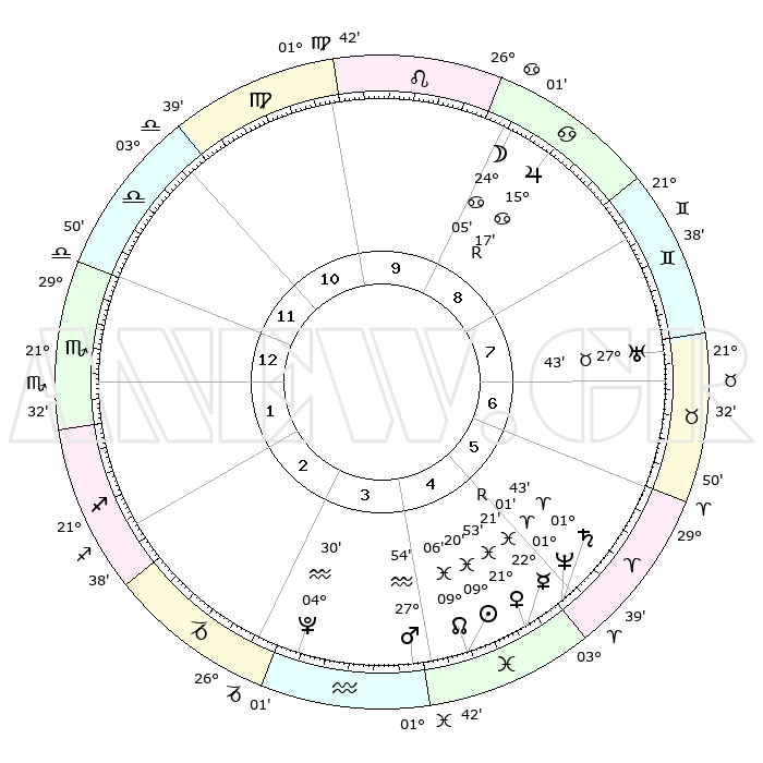 | | ΘΕΣΕΙΣ ΠΛΑΝΗΤΩΝ ΑΣΤΡΟΛΟΓΙΚΟΥ ΧΑΡΤΗ ΤΗΣ ΣΤΙΓΜΗΣ ΑΥΤΗΣ | | | | Πλανήτης | Ζώδιο | Μοίρες | Δεκαήμ. | Σε οίκο | Απόκλιση | | Ακμές των οίκων | | Ηλιος | Ιχθείς | 09°17' | Πρώτο | 4 | 08 S 05 | | 1ος | 07°27' | Σκορπιός | | Σελήνη | Καρκίνος | 23°24' | Τρίτο | 9 | 25 N 08 | | 2ος | 06°21' | Τοξότης | | Ερμής | Ιχθείς | 22°22'R | Τρίτο | 5 | 00 S 11 | | 3ος | 08°59' | Αιγόκερως | | Αφροδίτη | Ιχθείς | 21°49' | Τρίτο | 5 | 04 S 30 | | 4ος | 13°42' | Υδροχόος | | Αρης | Υδροχόος | 27°52' | Τρίτο | 4 | 13 S 14 | | 5ος | 16°28' | Ιχθείς | | Δίας | Καρκίνος | 15°17'R | Δεύτερο | 9 | 22 N 54 | | 6ος | 14°23' | Κριός | | Κρόνος | Κριός | 01°42' | Πρώτο | 5 | 01 S 17 | | 7ος | 07°27' | Ταύρος | | Ουρανός | Ταύρος | 27°42' | Τρίτο | 7 | 19 N 28 | | 8ος | 06°21' | Δίδυμοι | | Ποσειδώνας | Κριός | 01°01' | Πρώτο | 5 | 00 S 48 | | 9ος | 08°59' | Καρκίνος | | Πλούτωνας | Υδροχόος | 04°30' | Πρώτο | 3 | 22 S 53 | | 10ος | 13°42' | Λέων | | Β. Δεσμός | Ιχθείς | 09°06' | Πρώτο | 4 | 08 S 09 | | 11ος | 16°28' | Παρθένος | | Ωροσκόπος | Σκορπιός | 07°27' | Πρώτο | | | 12ος | 14°23' | Ζυγός | | Μεσουράνημα | Λέων | 13°42' | Δεύτερο | | | |