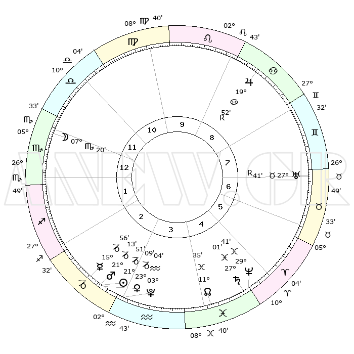 | | ΘΕΣΕΙΣ ΠΛΑΝΗΤΩΝ ΑΣΤΡΟΛΟΓΙΚΟΥ ΧΑΡΤΗ ΤΗΣ ΣΤΙΓΜΗΣ ΑΥΤΗΣ | | | | Πλανήτης | Ζώδιο | Μοίρες | Δεκαήμ. | Σε οίκο | Απόκλιση | | Ακμές των οίκων | | Ηλιος | Αιγόκερως | 21°46' | Τρίτο | 3 | 21 S 40 | | 1ος | 03°28' | Σκορπιός | | Σελήνη | Σκορπιός | 06°22' | Πρώτο | 1 | 17 S 39 | | 2ος | 02°06' | Τοξότης | | Ερμής | Αιγόκερως | 15°48' | Δεύτερο | 3 | 24 S 04 | | 3ος | 04°21' | Αιγόκερως | | Αφροδίτη | Αιγόκερως | 23°02' | Τρίτο | 3 | 22 S 20 | | 4ος | 08°46' | Υδροχόος | | Αρης | Αιγόκερως | 21°09' | Τρίτο | 3 | 22 S 43 | | 5ος | 11°38' | Ιχθείς | | Δίας | Καρκίνος | 19°53'R | Δεύτερο | 9 | 22 N 13 | | 6ος | 09°59' | Κριός | | Κρόνος | Ιχθείς | 27°01' | Τρίτο | 5 | 03 S 14 | | 7ος | 03°28' | Ταύρος | | Ουρανός | Ταύρος | 27°41'R | Τρίτο | 7 | 19 N 27 | | 8ος | 02°06' | Δίδυμοι | | Ποσειδώνας | Ιχθείς | 29°41' | Τρίτο | 5 | 01 S 21 | | 9ος | 04°21' | Καρκίνος | | Πλούτωνας | Υδροχόος | 03°04' | Πρώτο | 3 | 23 S 09 | | 10ος | 08°47' | Λέων | | Β. Δεσμός | Ιχθείς | 11°35' | Δεύτερο | 4 | 07 S 13 | | 11ος | 11°38' | Παρθένος | | Ωροσκόπος | Σκορπιός | 03°28' | Πρώτο | | | 12ος | 09°59' | Ζυγός | | Μεσουράνημα | Λέων | 08°47' | Πρώτο | | | |