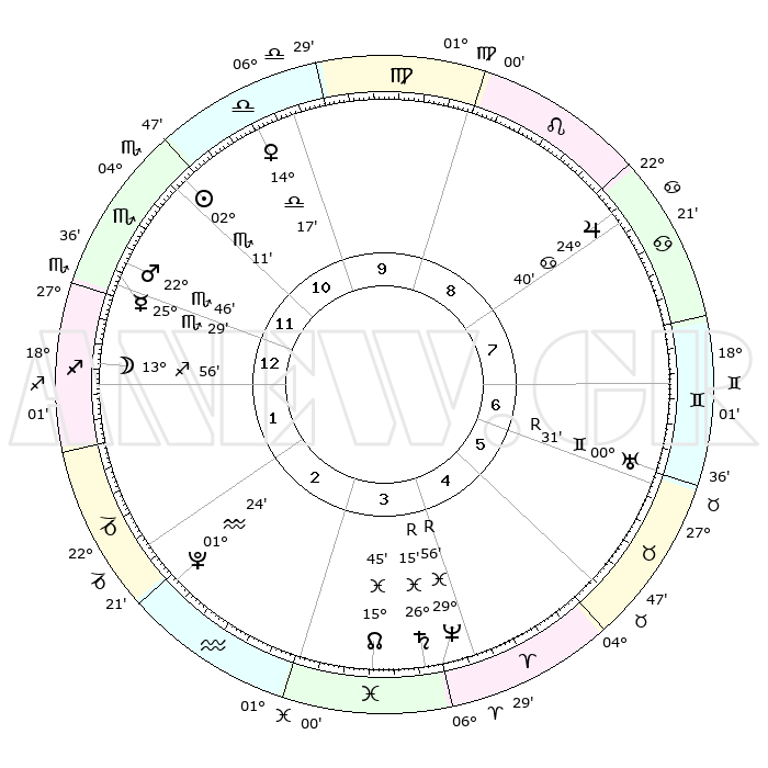 | | ΘΕΣΕΙΣ ΠΛΑΝΗΤΩΝ ΑΣΤΡΟΛΟΓΙΚΟΥ ΧΑΡΤΗ ΤΗΣ ΣΤΙΓΜΗΣ ΑΥΤΗΣ | | | | Πλανήτης | Ζώδιο | Μοίρες | Δεκαήμ. | Σε οίκο | Απόκλιση | | Ακμές των οίκων | | Ηλιος | Σκορπιός | 01°44' | Πρώτο | 4 | 12 S 04 | | 1ος | 03°12' | Λέων | | Σελήνη | Τοξότης | 08°28' | Πρώτο | 5 | 26 S 43 | | 2ος | 24°28' | Λέων | | Ερμής | Σκορπιός | 24°57' | Τρίτο | 4 | 21 S 32 | | 3ος | 19°57' | Παρθένος | | Αφροδίτη | Ζυγός | 13°42' | Δεύτερο | 3 | 04 S 00 | | 4ος | 21°22' | Ζυγός | | Αρης | Σκορπιός | 22°26' | Τρίτο | 4 | 18 S 41 | | 5ος | 27°19' | Σκορπιός | | Δίας | Καρκίνος | 24°38' | Τρίτο | 12 | 21 N 16 | | 6ος | 02°30' | Αιγόκερως | | Κρόνος | Ιχθείς | 26°17'R | Τρίτο | 9 | 03 S 45 | | 7ος | 03°12' | Υδροχόος | | Ουρανός | Δίδυμοι | 00°32'R | Πρώτο | 11 | 20 N 03 | | 8ος | 24°28' | Υδροχόος | | Ποσειδώνας | Ιχθείς | 29°56'R | Τρίτο | 9 | 01 S 17 | | 9ος | 19°57' | Ιχθείς | | Πλούτωνας | Υδροχόος | 01°24' | Πρώτο | 6 | 23 S 32 | | 10ος | 21°22' | Κριός | | Β. Δεσμός | Ιχθείς | 15°47' | Δεύτερο | 8 | 05 S 36 | | 11ος | 27°19' | Ταύρος | | Ωροσκόπος | Λέων | 03°12' | Πρώτο | | | 12ος | 02°30' | Καρκίνος | | Μεσουράνημα | Κριός | 21°22' | Τρίτο | | | |