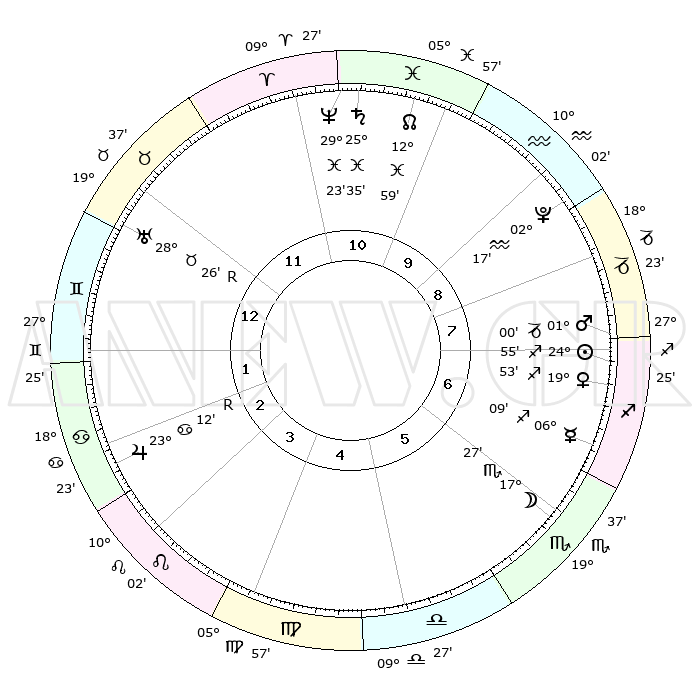 | | ΘΕΣΕΙΣ ΠΛΑΝΗΤΩΝ ΑΣΤΡΟΛΟΓΙΚΟΥ ΧΑΡΤΗ ΤΗΣ ΣΤΙΓΜΗΣ ΑΥΤΗΣ | | | | Πλανήτης | Ζώδιο | Μοίρες | Δεκαήμ. | Σε οίκο | Απόκλιση | | Ακμές των οίκων | | Ηλιος | Τοξότης | 24°36' | Τρίτο | 11 | 23 S 19 | | 1ος | 27°12' | Αιγόκερως | | Σελήνη | Σκορπιός | 13°48' | Δεύτερο | 9 | 20 S 09 | | 2ος | 10°49' | Ιχθείς | | Ερμής | Τοξότης | 05°43' | Πρώτο | 10 | 19 S 54 | | 3ος | 19°40' | Κριός | | Αφροδίτη | Τοξότης | 19°29' | Δεύτερο | 11 | 22 S 54 | | 4ος | 18°38' | Ταύρος | | Αρης | Αιγόκερως | 00°46' | Πρώτο | 11 | 24 S 13 | | 5ος | 11°36' | Δίδυμοι | | Δίας | Καρκίνος | 23°14'R | Τρίτο | 6 | 21 N 38 | | 6ος | 02°56' | Καρκίνος | | Κρόνος | Ιχθείς | 25°34' | Τρίτο | 2 | 03 S 53 | | 7ος | 27°12' | Καρκίνος | | Ουρανός | Ταύρος | 28°27'R | Τρίτο | 4 | 19 N 37 | | 8ος | 10°49' | Παρθένος | | Ποσειδώνας | Ιχθείς | 29°23' | Τρίτο | 2 | 01 S 29 | | 9ος | 19°40' | Ζυγός | | Πλούτωνας | Υδροχόος | 02°17' | Πρώτο | 1 | 23 S 19 | | 10ος | 18°38' | Σκορπιός | | Β. Δεσμός | Ιχθείς | 12°60' | Δεύτερο | 2 | 06 S 41 | | 11ος | 11°36' | Τοξότης | | Ωροσκόπος | Αιγόκερως | 27°12' | Τρίτο | | | 12ος | 02°56' | Αιγόκερως | | Μεσουράνημα | Σκορπιός | 18°38' | Δεύτερο | | | |