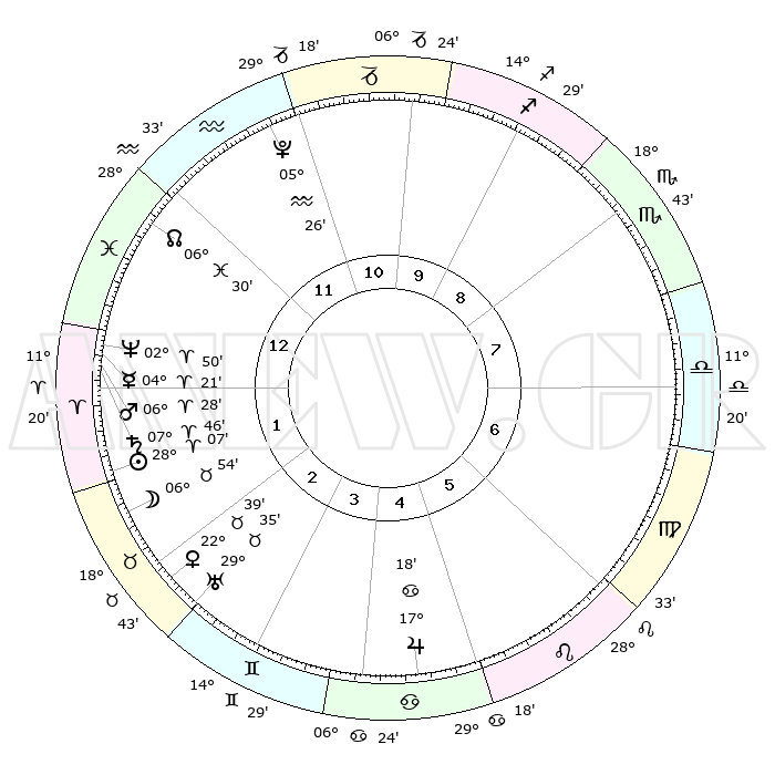 | | ΘΕΣΕΙΣ ΠΛΑΝΗΤΩΝ ΑΣΤΡΟΛΟΓΙΚΟΥ ΧΑΡΤΗ ΤΗΣ ΣΤΙΓΜΗΣ ΑΥΤΗΣ | | | | Πλανήτης | Ζώδιο | Μοίρες | Δεκαήμ. | Σε οίκο | Απόκλιση | | Ακμές των οίκων | | Ηλιος | Κριός | 28°03' | Τρίτο | 2 | 10 N 47 | | 1ος | 05°26' | Ιχθείς | | Σελήνη | Ταύρος | 05°59' | Πρώτο | 2 | 17 N 36 | | 2ος | 20°19' | Κριός | | Ερμής | Κριός | 04°15' | Πρώτο | 1 | 00 S 44 | | 3ος | 21°58' | Ταύρος | | Αφροδίτη | Ταύρος | 22°35' | Τρίτο | 3 | 18 N 43 | | 4ος | 15°52' | Δίδυμοι | | Αρης | Κριός | 06°25' | Πρώτο | 1 | 01 N 40 | | 5ος | 07°33' | Καρκίνος | | Δίας | Καρκίνος | 17°18' | Δεύτερο | 5 | 22 N 42 | | 6ος | 01°42' | Λέων | | Κρόνος | Κριός | 07°45' | Πρώτο | 1 | 01 N 06 | | 7ος | 05°26' | Παρθένος | | Ουρανός | Ταύρος | 29°35' | Τρίτο | 3 | 19 N 54 | | 8ος | 20°19' | Ζυγός | | Ποσειδώνας | Κριός | 02°50' | Πρώτο | 1 | 00 S 05 | | 9ος | 21°58' | Σκορπιός | | Πλούτωνας | Υδροχόος | 05°26' | Πρώτο | 12 | 22 S 47 | | 10ος | 15°52' | Τοξότης | | Β. Δεσμός | Ιχθείς | 06°30' | Πρώτο | 1 | 09 S 07 | | 11ος | 07°33' | Αιγόκερως | | Ωροσκόπος | Ιχθείς | 05°26' | Πρώτο | | | 12ος | 01°42' | Υδροχόος | | Μεσουράνημα | Τοξότης | 15°52' | Δεύτερο | | | |