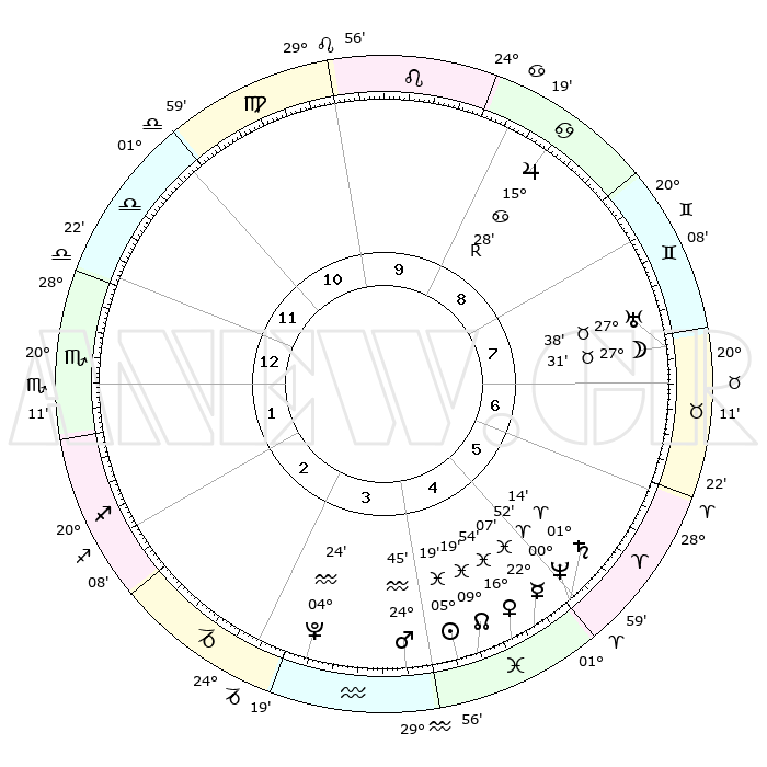 | | ΘΕΣΕΙΣ ΠΛΑΝΗΤΩΝ ΑΣΤΡΟΛΟΓΙΚΟΥ ΧΑΡΤΗ ΤΗΣ ΣΤΙΓΜΗΣ ΑΥΤΗΣ | | | | Πλανήτης | Ζώδιο | Μοίρες | Δεκαήμ. | Σε οίκο | Απόκλιση | | Ακμές των οίκων | | Ηλιος | Ιχθείς | 05°15' | Πρώτο | 4 | 09 S 35 | | 1ος | 03°41' | Σκορπιός | | Σελήνη | Ταύρος | 26°43' | Τρίτο | 7 | 24 N 26 | | 2ος | 02°19' | Τοξότης | | Ερμής | Ιχθείς | 22°05' | Τρίτο | 5 | 01 S 05 | | 3ος | 04°35' | Αιγόκερως | | Αφροδίτη | Ιχθείς | 16°50' | Δεύτερο | 5 | 06 S 31 | | 4ος | 09°02' | Υδροχόος | | Αρης | Υδροχόος | 24°43' | Τρίτο | 4 | 14 S 19 | | 5ος | 11°54' | Ιχθείς | | Δίας | Καρκίνος | 15°28'R | Δεύτερο | 9 | 22 N 52 | | 6ος | 10°13' | Κριός | | Κρόνος | Κριός | 01°14' | Πρώτο | 5 | 01 S 28 | | 7ος | 03°41' | Ταύρος | | Ουρανός | Ταύρος | 27°38' | Τρίτο | 7 | 19 N 27 | | 8ος | 02°20' | Δίδυμοι | | Ποσειδώνας | Κριός | 00°52' | Πρώτο | 5 | 00 S 51 | | 9ος | 04°35' | Καρκίνος | | Πλούτωνας | Υδροχόος | 04°24' | Πρώτο | 3 | 22 S 54 | | 10ος | 09°02' | Λέων | | Β. Δεσμός | Ιχθείς | 09°19' | Πρώτο | 4 | 08 S 04 | | 11ος | 11°54' | Παρθένος | | Ωροσκόπος | Σκορπιός | 03°41' | Πρώτο | | | 12ος | 10°13' | Ζυγός | | Μεσουράνημα | Λέων | 09°02' | Πρώτο | | | |
