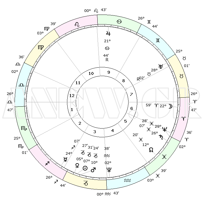| | ΘΕΣΕΙΣ ΠΛΑΝΗΤΩΝ ΑΣΤΡΟΛΟΓΙΚΟΥ ΧΑΡΤΗ ΤΗΣ ΣΤΙΓΜΗΣ ΑΥΤΗΣ | | | | Πλανήτης | Ζώδιο | Μοίρες | Δεκαήμ. | Σε οίκο | Απόκλιση | | Ακμές των οίκων | | Ηλιος | Αιγόκερως | 07°27' | Πρώτο | 3 | 23 S 13 | | 1ος | 07°14' | Ζυγός | | Σελήνη | Κριός | 22°03' | Τρίτο | 7 | 11 N 40 | | 2ος | 04°19' | Σκορπιός | | Ερμής | Τοξότης | 24°01' | Τρίτο | 3 | 23 S 31 | | 3ος | 05°02' | Τοξότης | | Αφροδίτη | Αιγόκερως | 05°22' | Πρώτο | 3 | 23 S 43 | | 4ος | 08°08' | Αιγόκερως | | Αρης | Αιγόκερως | 10°21' | Δεύτερο | 4 | 23 S 54 | | 5ος | 11°04' | Υδροχόος | | Δίας | Καρκίνος | 21°45'R | Τρίτο | 10 | 21 N 54 | | 6ος | 11°12' | Ιχθείς | | Κρόνος | Ιχθείς | 26°07' | Τρίτο | 6 | 03 S 38 | | 7ος | 07°14' | Κριός | | Ουρανός | Ταύρος | 28°02'R | Τρίτο | 8 | 19 N 31 | | 8ος | 04°19' | Ταύρος | | Ποσειδώνας | Ιχθείς | 29°28' | Τρίτο | 6 | 01 S 26 | | 9ος | 05°02' | Δίδυμοι | | Πλούτωνας | Υδροχόος | 02°38' | Πρώτο | 4 | 23 S 14 | | 10ος | 08°08' | Καρκίνος | | Β. Δεσμός | Ιχθείς | 12°20' | Δεύτερο | 6 | 06 S 56 | | 11ος | 11°04' | Λέων | | Ωροσκόπος | Ζυγός | 07°14' | Πρώτο | | | 12ος | 11°12' | Παρθένος | | Μεσουράνημα | Καρκίνος | 08°08' | Πρώτο | | | |