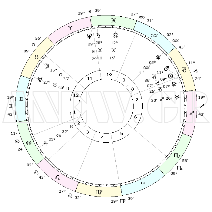 | | ΘΕΣΕΙΣ ΠΛΑΝΗΤΩΝ ΑΣΤΡΟΛΟΓΙΚΟΥ ΧΑΡΤΗ ΤΗΣ ΣΤΙΓΜΗΣ ΑΥΤΗΣ | | | | Πλανήτης | Ζώδιο | Μοίρες | Δεκαήμ. | Σε οίκο | Απόκλιση | | Ακμές των οίκων | | Ηλιος | Αιγόκερως | 09°02' | Πρώτο | 9 | 23 S 07 | | 1ος | 18°30' | Ταύρος | | Σελήνη | Ταύρος | 14°27' | Δεύτερο | 12 | 20 N 30 | | 2ος | 15°52' | Δίδυμοι | | Ερμής | Τοξότης | 26°23' | Τρίτο | 8 | 23 S 47 | | 3ος | 07°52' | Καρκίνος | | Αφροδίτη | Αιγόκερως | 07°20' | Πρώτο | 8 | 23 S 41 | | 4ος | 29°58' | Καρκίνος | | Αρης | Αιγόκερως | 11°33' | Δεύτερο | 9 | 23 S 49 | | 5ος | 26°36' | Λέων | | Δίας | Καρκίνος | 21°33'R | Τρίτο | 3 | 21 N 56 | | 6ος | 03°00' | Ζυγός | | Κρόνος | Ιχθείς | 26°12' | Τρίτο | 11 | 03 S 35 | | 7ος | 18°30' | Σκορπιός | | Ουρανός | Ταύρος | 27°59'R | Τρίτο | 1 | 19 N 31 | | 8ος | 15°52' | Τοξότης | | Ποσειδώνας | Ιχθείς | 29°29' | Τρίτο | 11 | 01 S 26 | | 9ος | 07°52' | Αιγόκερως | | Πλούτωνας | Υδροχόος | 02°41' | Πρώτο | 10 | 23 S 14 | | 10ος | 29°58' | Αιγόκερως | | Β. Δεσμός | Ιχθείς | 12°15' | Δεύτερο | 11 | 06 S 58 | | 11ος | 26°36' | Υδροχόος | | Ωροσκόπος | Ταύρος | 18°30' | Δεύτερο | | | 12ος | 03°00' | Κριός | | Μεσουράνημα | Αιγόκερως | 29°58' | Τρίτο | | | |