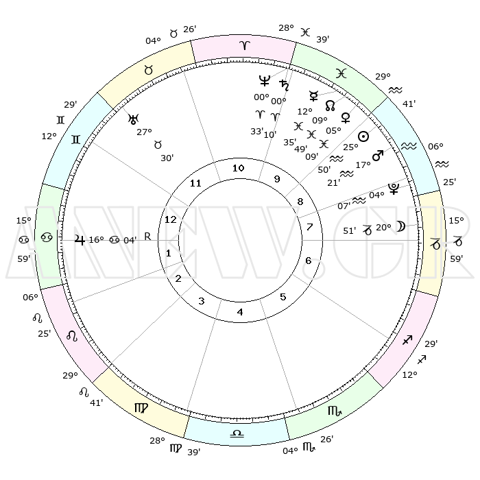 | | ΘΕΣΕΙΣ ΠΛΑΝΗΤΩΝ ΑΣΤΡΟΛΟΓΙΚΟΥ ΧΑΡΤΗ ΤΗΣ ΣΤΙΓΜΗΣ ΑΥΤΗΣ | | | | Πλανήτης | Ζώδιο | Μοίρες | Δεκαήμ. | Σε οίκο | Απόκλιση | | Ακμές των οίκων | | Ηλιος | Υδροχόος | 25°46' | Τρίτο | 9 | 12 S 56 | | 1ος | 22°23' | Δίδυμοι | | Σελήνη | Αιγόκερως | 19°57' | Δεύτερο | 8 | 25 S 53 | | 2ος | 13°47' | Καρκίνος | | Ερμής | Ιχθείς | 12°28' | Δεύτερο | 10 | 06 S 56 | | 3ος | 05°12' | Λέων | | Αφροδίτη | Ιχθείς | 05°03' | Πρώτο | 10 | 11 S 01 | | 4ος | 00°22' | Παρθένος | | Αρης | Υδροχόος | 17°18' | Δεύτερο | 9 | 16 S 40 | | 5ος | 02°60' | Ζυγός | | Δίας | Καρκίνος | 16°04'R | Δεύτερο | 2 | 22 N 47 | | 6ος | 13°18' | Σκορπιός | | Κρόνος | Κριός | 00°10' | Πρώτο | 10 | 01 S 54 | | 7ος | 22°23' | Τοξότης | | Ουρανός | Ταύρος | 27°30' | Τρίτο | 12 | 19 N 25 | | 8ος | 13°47' | Αιγόκερως | | Ποσειδώνας | Κριός | 00°33' | Πρώτο | 10 | 00 S 59 | | 9ος | 05°12' | Υδροχόος | | Πλούτωνας | Υδροχόος | 04°07' | Πρώτο | 8 | 22 S 57 | | 10ος | 00°22' | Ιχθείς | | Β. Δεσμός | Ιχθείς | 09°49' | Πρώτο | 10 | 07 S 53 | | 11ος | 02°60' | Κριός | | Ωροσκόπος | Δίδυμοι | 22°23' | Τρίτο | | | 12ος | 13°18' | Ταύρος | | Μεσουράνημα | Ιχθείς | 00°22' | Πρώτο | | | |