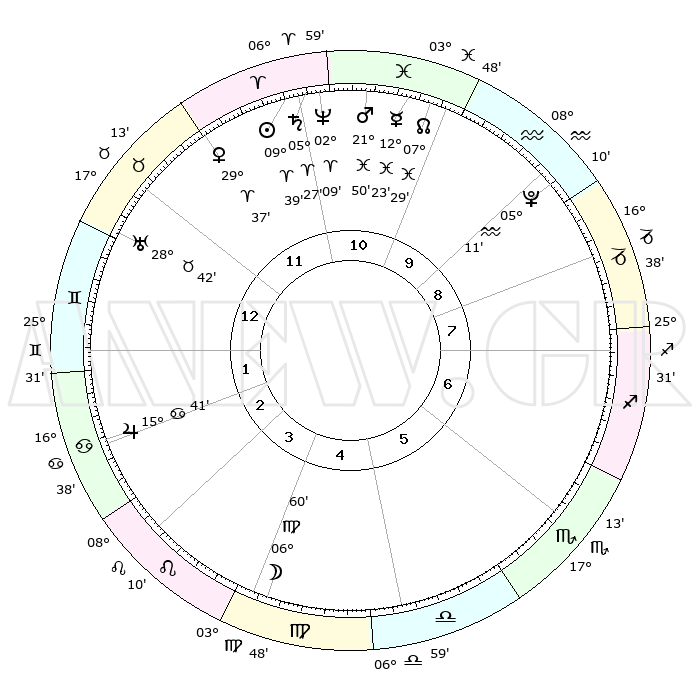 | | ΘΕΣΕΙΣ ΠΛΑΝΗΤΩΝ ΑΣΤΡΟΛΟΓΙΚΟΥ ΧΑΡΤΗ ΤΗΣ ΣΤΙΓΜΗΣ ΑΥΤΗΣ | | | | Πλανήτης | Ζώδιο | Μοίρες | Δεκαήμ. | Σε οίκο | Απόκλιση | | Ακμές των οίκων | | Ηλιος | Κριός | 09°34' | Πρώτο | 11 | 03 N 47 | | 1ος | 24°30' | Ταύρος | | Σελήνη | Παρθένος | 05°57' | Πρώτο | 5 | 09 N 34 | | 2ος | 20°29' | Δίδυμοι | | Ερμής | Ιχθείς | 12°19' | Δεύτερο | 11 | 07 S 53 | | 3ος | 12°08' | Καρκίνος | | Αφροδίτη | Κριός | 29°31' | Τρίτο | 12 | 10 N 49 | | 4ος | 04°32' | Λέων | | Αρης | Ιχθείς | 21°46' | Τρίτο | 11 | 04 S 14 | | 5ος | 02°05' | Παρθένος | | Δίας | Καρκίνος | 15°40' | Δεύτερο | 3 | 22 N 53 | | 6ος | 09°36' | Ζυγός | | Κρόνος | Κριός | 05°27' | Πρώτο | 11 | 00 N 13 | | 7ος | 24°30' | Σκορπιός | | Ουρανός | Ταύρος | 28°41' | Τρίτο | 1 | 19 N 42 | | 8ος | 20°29' | Τοξότης | | Ποσειδώνας | Κριός | 02°09' | Πρώτο | 11 | 00 S 21 | | 9ος | 12°08' | Αιγόκερως | | Πλούτωνας | Υδροχόος | 05°11' | Πρώτο | 10 | 22 S 48 | | 10ος | 04°32' | Υδροχόος | | Β. Δεσμός | Ιχθείς | 07°30' | Πρώτο | 11 | 08 S 45 | | 11ος | 02°05' | Ιχθείς | | Ωροσκόπος | Ταύρος | 24°30' | Τρίτο | | | 12ος | 09°36' | Κριός | | Μεσουράνημα | Υδροχόος | 04°32' | Πρώτο | | | |