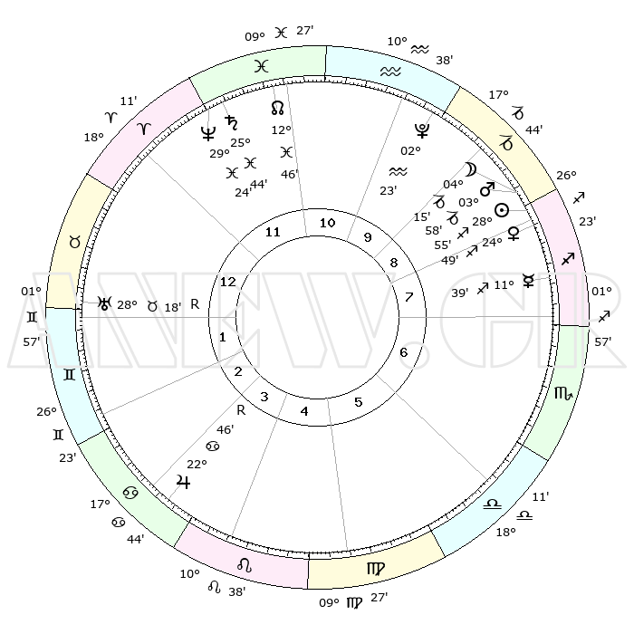 | | ΘΕΣΕΙΣ ΠΛΑΝΗΤΩΝ ΑΣΤΡΟΛΟΓΙΚΟΥ ΧΑΡΤΗ ΤΗΣ ΣΤΙΓΜΗΣ ΑΥΤΗΣ | | | | Πλανήτης | Ζώδιο | Μοίρες | Δεκαήμ. | Σε οίκο | Απόκλιση | | Ακμές των οίκων | | Ηλιος | Τοξότης | 28°50' | Τρίτο | 9 | 23 S 26 | | 1ος | 23°17' | Κριός | | Σελήνη | Αιγόκερως | 03°18' | Πρώτο | 9 | 28 S 03 | | 2ος | 27°23' | Ταύρος | | Ερμής | Τοξότης | 11°32' | Δεύτερο | 8 | 21 S 20 | | 3ος | 21°40' | Δίδυμοι | | Αφροδίτη | Τοξότης | 24°43' | Τρίτο | 9 | 23 S 23 | | 4ος | 13°22' | Καρκίνος | | Αρης | Αιγόκερως | 03°55' | Πρώτο | 9 | 24 S 11 | | 5ος | 07°09' | Λέων | | Δίας | Καρκίνος | 22°46'R | Τρίτο | 4 | 21 N 43 | | 6ος | 08°34' | Παρθένος | | Κρόνος | Ιχθείς | 25°43' | Τρίτο | 12 | 03 S 49 | | 7ος | 23°17' | Ζυγός | | Ουρανός | Ταύρος | 28°18'R | Τρίτο | 2 | 19 N 35 | | 8ος | 27°23' | Σκορπιός | | Ποσειδώνας | Ιχθείς | 29°24' | Τρίτο | 12 | 01 S 28 | | 9ος | 21°40' | Τοξότης | | Πλούτωνας | Υδροχόος | 02°23' | Πρώτο | 10 | 23 S 17 | | 10ος | 13°22' | Αιγόκερως | | Β. Δεσμός | Ιχθείς | 12°47' | Δεύτερο | 12 | 06 S 46 | | 11ος | 07°09' | Υδροχόος | | Ωροσκόπος | Κριός | 23°17' | Τρίτο | | | 12ος | 08°34' | Ιχθείς | | Μεσουράνημα | Αιγόκερως | 13°22' | Δεύτερο | | | |