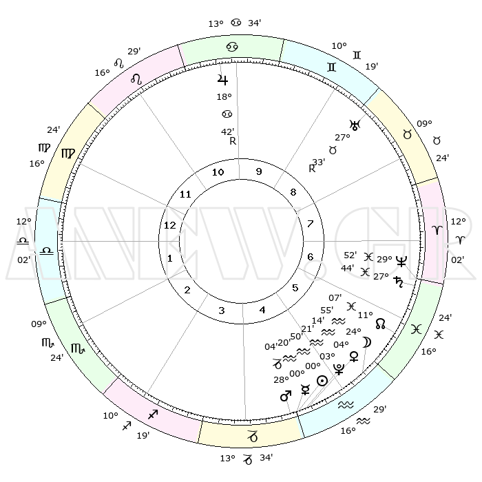 | | ΘΕΣΕΙΣ ΠΛΑΝΗΤΩΝ ΑΣΤΡΟΛΟΓΙΚΟΥ ΧΑΡΤΗ ΤΗΣ ΣΤΙΓΜΗΣ ΑΥΤΗΣ | | | | Πλανήτης | Ζώδιο | Μοίρες | Δεκαήμ. | Σε οίκο | Απόκλιση | | Ακμές των οίκων | | Ηλιος | Υδροχόος | 00°45' | Πρώτο | 5 | 19 S 59 | | 1ος | 16°02' | Παρθένος | | Σελήνη | Υδροχόος | 23°47' | Τρίτο | 6 | 14 S 54 | | 2ος | 11°29' | Ζυγός | | Ερμής | Υδροχόος | 00°12' | Πρώτο | 5 | 22 S 05 | | 3ος | 11°18' | Σκορπιός | | Αφροδίτη | Υδροχόος | 04°08' | Πρώτο | 5 | 20 S 20 | | 4ος | 14°14' | Τοξότης | | Αρης | Αιγόκερως | 27°60' | Τρίτο | 5 | 21 S 32 | | 5ος | 17°33' | Αιγόκερως | | Δίας | Καρκίνος | 18°43'R | Δεύτερο | 11 | 22 N 24 | | 6ος | 18°33' | Υδροχόος | | Κρόνος | Ιχθείς | 27°43' | Τρίτο | 7 | 02 S 56 | | 7ος | 16°02' | Ιχθείς | | Ουρανός | Ταύρος | 27°33'R | Τρίτο | 9 | 19 N 25 | | 8ος | 11°29' | Κριός | | Ποσειδώνας | Ιχθείς | 29°52' | Τρίτο | 7 | 01 S 16 | | 9ος | 11°18' | Ταύρος | | Πλούτωνας | Υδροχόος | 03°21' | Πρώτο | 5 | 23 S 05 | | 10ος | 14°14' | Δίδυμοι | | Β. Δεσμός | Ιχθείς | 11°07' | Δεύτερο | 6 | 07 S 24 | | 11ος | 17°33' | Καρκίνος | | Ωροσκόπος | Παρθένος | 16°02' | Δεύτερο | | | 12ος | 18°33' | Λέων | | Μεσουράνημα | Δίδυμοι | 14°14' | Δεύτερο | | | |