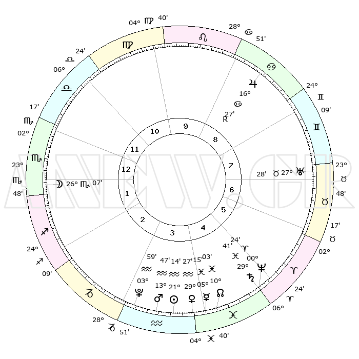 | | ΘΕΣΕΙΣ ΠΛΑΝΗΤΩΝ ΑΣΤΡΟΛΟΓΙΚΟΥ ΧΑΡΤΗ ΤΗΣ ΣΤΙΓΜΗΣ ΑΥΤΗΣ | | | | Πλανήτης | Ζώδιο | Μοίρες | Δεκαήμ. | Σε οίκο | Απόκλιση | | Ακμές των οίκων | | Ηλιος | Υδροχόος | 21°10' | Τρίτο | 4 | 14 S 26 | | 1ος | 07°18' | Σκορπιός | | Σελήνη | Σκορπιός | 25°27' | Τρίτο | 1 | 24 S 04 | | 2ος | 06°11' | Τοξότης | | Ερμής | Ιχθείς | 05°10' | Πρώτο | 4 | 10 S 28 | | 3ος | 08°48' | Αιγόκερως | | Αφροδίτη | Υδροχόος | 29°23' | Τρίτο | 4 | 13 S 03 | | 4ος | 13°30' | Υδροχόος | | Αρης | Υδροχόος | 13°44' | Δεύτερο | 4 | 17 S 43 | | 5ος | 16°16' | Ιχθείς | | Δίας | Καρκίνος | 16°27'R | Δεύτερο | 9 | 22 N 44 | | 6ος | 14°13' | Κριός | | Κρόνος | Ιχθείς | 29°40' | Τρίτο | 5 | 02 S 07 | | 7ος | 07°18' | Ταύρος | | Ουρανός | Ταύρος | 27°28' | Τρίτο | 7 | 19 N 25 | | 8ος | 06°11' | Δίδυμοι | | Ποσειδώνας | Κριός | 00°24' | Πρώτο | 5 | 01 S 03 | | 9ος | 08°48' | Καρκίνος | | Πλούτωνας | Υδροχόος | 03°59' | Πρώτο | 3 | 22 S 58 | | 10ος | 13°30' | Λέων | | Β. Δεσμός | Ιχθείς | 10°03' | Δεύτερο | 4 | 07 S 48 | | 11ος | 16°16' | Παρθένος | | Ωροσκόπος | Σκορπιός | 07°18' | Πρώτο | | | 12ος | 14°13' | Ζυγός | | Μεσουράνημα | Λέων | 13°30' | Δεύτερο | | | |