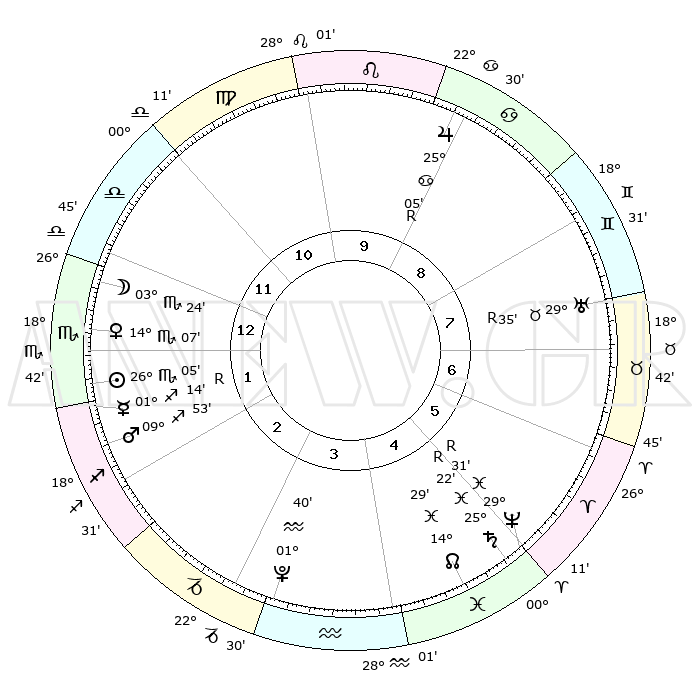 | | ΘΕΣΕΙΣ ΠΛΑΝΗΤΩΝ ΑΣΤΡΟΛΟΓΙΚΟΥ ΧΑΡΤΗ ΤΗΣ ΣΤΙΓΜΗΣ ΑΥΤΗΣ | | | | Πλανήτης | Ζώδιο | Μοίρες | Δεκαήμ. | Σε οίκο | Απόκλιση | | Ακμές των οίκων | | Ηλιος | Σκορπιός | 26°01' | Τρίτο | 1 | 19 S 15 | | 1ος | 28°10' | Ζυγός | | Σελήνη | Σκορπιός | 02°33' | Πρώτο | 1 | 15 S 48 | | 2ος | 26°28' | Σκορπιός | | Ερμής | Τοξότης | 01°19'R | Πρώτο | 2 | 20 S 39 | | 3ος | 28°17' | Τοξότης | | Αφροδίτη | Σκορπιός | 14°02' | Δεύτερο | 1 | 14 S 58 | | 4ος | 02°21' | Υδροχόος | | Αρης | Τοξότης | 09°50' | Πρώτο | 2 | 22 S 28 | | 5ος | 05°17' | Ιχθείς | | Δίας | Καρκίνος | 25°05'R | Τρίτο | 9 | 21 N 14 | | 6ος | 04°07' | Κριός | | Κρόνος | Ιχθείς | 25°22'R | Τρίτο | 5 | 04 S 03 | | 7ος | 28°10' | Κριός | | Ουρανός | Ταύρος | 29°35'R | Τρίτο | 8 | 19 N 51 | | 8ος | 26°28' | Ταύρος | | Ποσειδώνας | Ιχθείς | 29°31'R | Τρίτο | 5 | 01 S 27 | | 9ος | 28°17' | Δίδυμοι | | Πλούτωνας | Υδροχόος | 01°40' | Πρώτο | 3 | 23 S 27 | | 10ος | 02°21' | Λέων | | Β. Δεσμός | Ιχθείς | 14°30' | Δεύτερο | 5 | 06 S 06 | | 11ος | 05°17' | Παρθένος | | Ωροσκόπος | Ζυγός | 28°10' | Τρίτο | | | 12ος | 04°07' | Ζυγός | | Μεσουράνημα | Λέων | 02°21' | Πρώτο | | | |