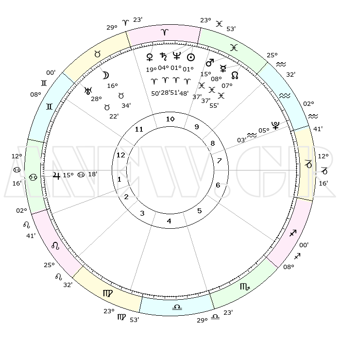 | | ΘΕΣΕΙΣ ΠΛΑΝΗΤΩΝ ΑΣΤΡΟΛΟΓΙΚΟΥ ΧΑΡΤΗ ΤΗΣ ΣΤΙΓΜΗΣ ΑΥΤΗΣ | | | | Πλανήτης | Ζώδιο | Μοίρες | Δεκαήμ. | Σε οίκο | Απόκλιση | | Ακμές των οίκων | | Ηλιος | Κριός | 01°44' | Πρώτο | 11 | 00 N 41 | | 1ος | 20°19' | Δίδυμοι | | Σελήνη | Ταύρος | 15°36' | Δεύτερο | 12 | 21 N 06 | | 2ος | 11°56' | Καρκίνος | | Ερμής | Ιχθείς | 08°37' | Πρώτο | 10 | 07 S 46 | | 3ος | 03°16' | Λέων | | Αφροδίτη | Κριός | 19°45' | Δεύτερο | 11 | 06 N 58 | | 4ος | 28°09' | Λέων | | Αρης | Ιχθείς | 15°34' | Δεύτερο | 10 | 06 S 41 | | 5ος | 00°24' | Ζυγός | | Δίας | Καρκίνος | 15°17' | Δεύτερο | 2 | 22 N 55 | | 6ος | 10°41' | Σκορπιός | | Κρόνος | Κριός | 04°27' | Πρώτο | 11 | 00 S 11 | | 7ος | 20°19' | Τοξότης | | Ουρανός | Ταύρος | 28°22' | Τρίτο | 12 | 19 N 37 | | 8ος | 11°56' | Αιγόκερως | | Ποσειδώνας | Κριός | 01°51' | Πρώτο | 11 | 00 S 28 | | 9ος | 03°16' | Υδροχόος | | Πλούτωνας | Υδροχόος | 05°03' | Πρώτο | 9 | 22 S 48 | | 10ος | 28°09' | Υδροχόος | | Β. Δεσμός | Ιχθείς | 07°55' | Πρώτο | 10 | 08 S 36 | | 11ος | 00°24' | Κριός | | Ωροσκόπος | Δίδυμοι | 20°19' | Τρίτο | | | 12ος | 10°41' | Ταύρος | | Μεσουράνημα | Υδροχόος | 28°09' | Τρίτο | | | |