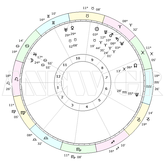 | | ΘΕΣΕΙΣ ΠΛΑΝΗΤΩΝ ΑΣΤΡΟΛΟΓΙΚΟΥ ΧΑΡΤΗ ΤΗΣ ΣΤΙΓΜΗΣ ΑΥΤΗΣ | | | | Πλανήτης | Ζώδιο | Μοίρες | Δεκαήμ. | Σε οίκο | Απόκλιση | | Ακμές των οίκων | | Ηλιος | Ταύρος | 03°15' | Πρώτο | 10 | 12 N 36 | | 1ος | 02°32' | Λέων | | Σελήνη | Καρκίνος | 24°09' | Τρίτο | 12 | 24 N 43 | | 2ος | 23°45' | Λέων | | Ερμής | Κριός | 12°38' | Δεύτερο | 9 | 02 N 40 | | 3ος | 19°08' | Παρθένος | | Αφροδίτη | Ταύρος | 29°04' | Τρίτο | 11 | 20 N 29 | | 4ος | 20°28' | Ζυγός | | Αρης | Κριός | 10°32' | Δεύτερο | 9 | 03 N 19 | | 5ος | 26°27' | Σκορπιός | | Δίας | Καρκίνος | 17°55' | Δεύτερο | 12 | 22 N 37 | | 6ος | 01°44' | Αιγόκερως | | Κρόνος | Κριός | 08°23' | Πρώτο | 9 | 01 N 21 | | 7ος | 02°32' | Υδροχόος | | Ουρανός | Ταύρος | 29°52' | Τρίτο | 11 | 19 N 57 | | 8ος | 23°45' | Υδροχόος | | Ποσειδώνας | Κριός | 03°01' | Πρώτο | 9 | 00 S 01 | | 9ος | 19°08' | Ιχθείς | | Πλούτωνας | Υδροχόος | 05°28' | Πρώτο | 7 | 22 S 48 | | 10ος | 20°28' | Κριός | | Β. Δεσμός | Ιχθείς | 06°13' | Πρώτο | 8 | 09 S 14 | | 11ος | 26°27' | Ταύρος | | Ωροσκόπος | Λέων | 02°32' | Πρώτο | | | 12ος | 01°44' | Καρκίνος | | Μεσουράνημα | Κριός | 20°28' | Τρίτο | | | |