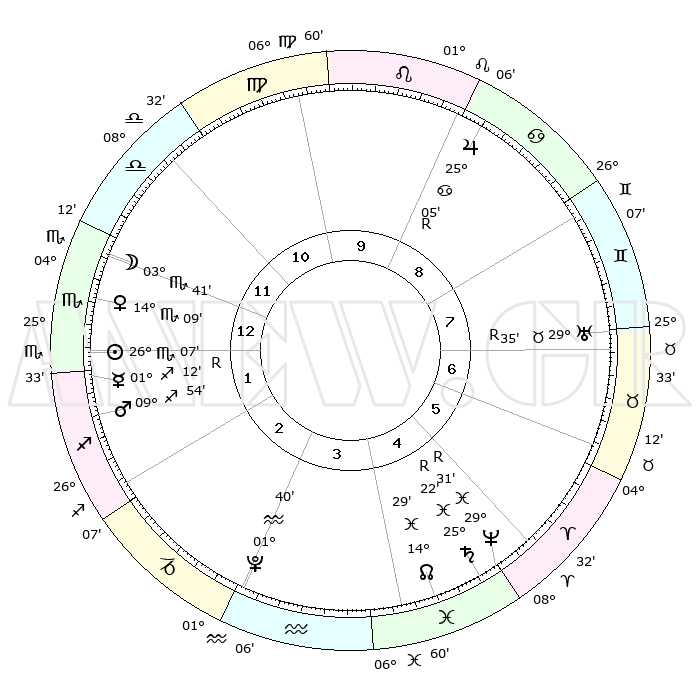 | | ΘΕΣΕΙΣ ΠΛΑΝΗΤΩΝ ΑΣΤΡΟΛΟΓΙΚΟΥ ΧΑΡΤΗ ΤΗΣ ΣΤΙΓΜΗΣ ΑΥΤΗΣ | | | | Πλανήτης | Ζώδιο | Μοίρες | Δεκαήμ. | Σε οίκο | Απόκλιση | | Ακμές των οίκων | | Ηλιος | Σκορπιός | 26°03' | Τρίτο | 1 | 19 S 16 | | 1ος | 06°27' | Σκορπιός | | Σελήνη | Σκορπιός | 02°54' | Πρώτο | 12 | 15 S 56 | | 2ος | 05°16' | Τοξότης | | Ερμής | Τοξότης | 01°17'R | Πρώτο | 1 | 20 S 38 | | 3ος | 07°47' | Αιγόκερως | | Αφροδίτη | Σκορπιός | 14°04' | Δεύτερο | 1 | 14 S 59 | | 4ος | 12°26' | Υδροχόος | | Αρης | Τοξότης | 09°51' | Πρώτο | 2 | 22 S 28 | | 5ος | 15°14' | Ιχθείς | | Δίας | Καρκίνος | 25°05'R | Τρίτο | 9 | 21 N 14 | | 6ος | 13°16' | Κριός | | Κρόνος | Ιχθείς | 25°22'R | Τρίτο | 5 | 04 S 03 | | 7ος | 06°27' | Ταύρος | | Ουρανός | Ταύρος | 29°35'R | Τρίτο | 7 | 19 N 51 | | 8ος | 05°16' | Δίδυμοι | | Ποσειδώνας | Ιχθείς | 29°31'R | Τρίτο | 5 | 01 S 27 | | 9ος | 07°47' | Καρκίνος | | Πλούτωνας | Υδροχόος | 01°40' | Πρώτο | 3 | 23 S 27 | | 10ος | 12°26' | Λέων | | Β. Δεσμός | Ιχθείς | 14°29' | Δεύτερο | 4 | 06 S 06 | | 11ος | 15°14' | Παρθένος | | Ωροσκόπος | Σκορπιός | 06°27' | Πρώτο | | | 12ος | 13°16' | Ζυγός | | Μεσουράνημα | Λέων | 12°26' | Δεύτερο | | | |