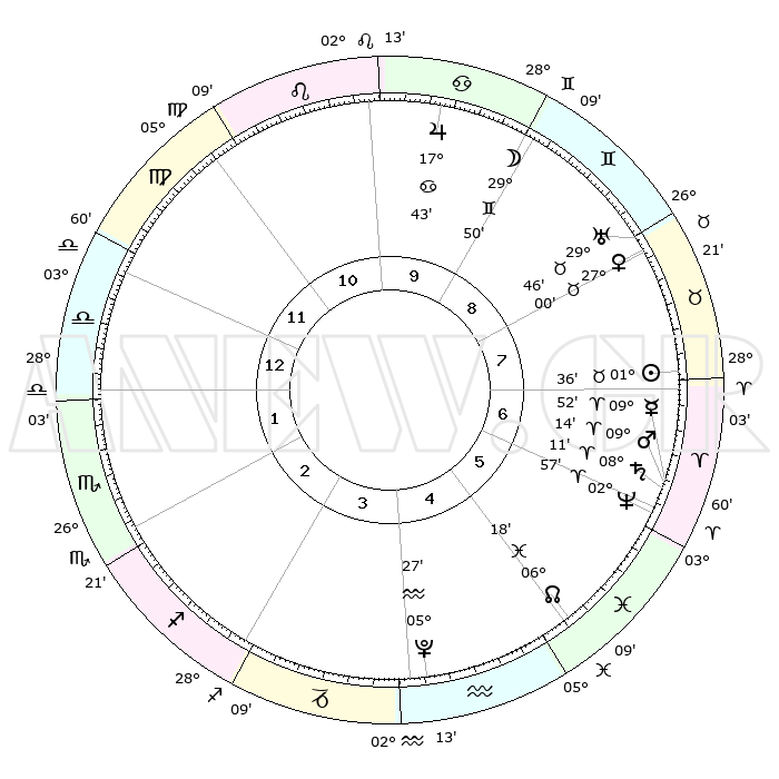 | | ΘΕΣΕΙΣ ΠΛΑΝΗΤΩΝ ΑΣΤΡΟΛΟΓΙΚΟΥ ΧΑΡΤΗ ΤΗΣ ΣΤΙΓΜΗΣ ΑΥΤΗΣ | | | | Πλανήτης | Ζώδιο | Μοίρες | Δεκαήμ. | Σε οίκο | Απόκλιση | | Ακμές των οίκων | | Ηλιος | Ταύρος | 01°32' | Πρώτο | 7 | 12 N 00 | | 1ος | 08°30' | Ζυγός | | Σελήνη | Δίδυμοι | 28°51' | Τρίτο | 9 | 28 N 11 | | 2ος | 05°40' | Σκορπιός | | Ερμής | Κριός | 09°46' | Πρώτο | 7 | 01 N 29 | | 3ος | 06°26' | Τοξότης | | Αφροδίτη | Ταύρος | 26°55' | Τρίτο | 8 | 19 N 56 | | 4ος | 09°34' | Αιγόκερως | | Αρης | Κριός | 09°11' | Πρώτο | 7 | 02 N 46 | | 5ος | 12°30' | Υδροχόος | | Δίας | Καρκίνος | 17°42' | Δεύτερο | 10 | 22 N 39 | | 6ος | 12°35' | Ιχθείς | | Κρόνος | Κριός | 08°11' | Πρώτο | 6 | 01 N 16 | | 7ος | 08°30' | Κριός | | Ουρανός | Ταύρος | 29°46' | Τρίτο | 8 | 19 N 56 | | 8ος | 05°40' | Ταύρος | | Ποσειδώνας | Κριός | 02°57' | Πρώτο | 6 | 00 S 02 | | 9ος | 06°26' | Δίδυμοι | | Πλούτωνας | Υδροχόος | 05°27' | Πρώτο | 4 | 22 S 48 | | 10ος | 09°34' | Καρκίνος | | Β. Δεσμός | Ιχθείς | 06°19' | Πρώτο | 5 | 09 S 12 | | 11ος | 12°30' | Λέων | | Ωροσκόπος | Ζυγός | 08°30' | Πρώτο | | | 12ος | 12°35' | Παρθένος | | Μεσουράνημα | Καρκίνος | 09°34' | Πρώτο | | | |