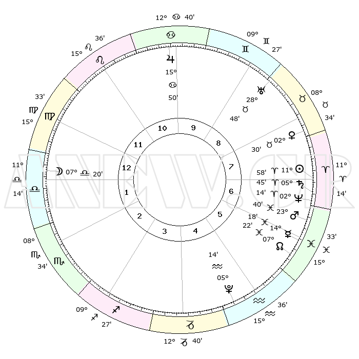 | | ΘΕΣΕΙΣ ΠΛΑΝΗΤΩΝ ΑΣΤΡΟΛΟΓΙΚΟΥ ΧΑΡΤΗ ΤΗΣ ΣΤΙΓΜΗΣ ΑΥΤΗΣ | | | | Πλανήτης | Ζώδιο | Μοίρες | Δεκαήμ. | Σε οίκο | Απόκλιση | | Ακμές των οίκων | | Ηλιος | Κριός | 11°54' | Δεύτερο | 7 | 04 N 42 | | 1ος | 21°35' | Παρθένος | | Σελήνη | Ζυγός | 06°29' | Πρώτο | 1 | 04 S 48 | | 2ος | 17°31' | Ζυγός | | Ερμής | Ιχθείς | 14°15' | Δεύτερο | 6 | 07 S 30 | | 3ος | 17°36' | Σκορπιός | | Αφροδίτη | Ταύρος | 02°25' | Πρώτο | 8 | 11 N 55 | | 4ος | 20°32' | Τοξότης | | Αρης | Ιχθείς | 23°37' | Τρίτο | 7 | 03 S 29 | | 5ος | 23°40' | Αιγόκερως | | Δίας | Καρκίνος | 15°49' | Δεύτερο | 10 | 22 N 52 | | 6ος | 24°26' | Υδροχόος | | Κρόνος | Κριός | 05°44' | Πρώτο | 7 | 00 N 19 | | 7ος | 21°35' | Ιχθείς | | Ουρανός | Ταύρος | 28°47' | Τρίτο | 9 | 19 N 43 | | 8ος | 17°31' | Κριός | | Ποσειδώνας | Κριός | 02°14' | Πρώτο | 7 | 00 S 19 | | 9ος | 17°36' | Ταύρος | | Πλούτωνας | Υδροχόος | 05°14' | Πρώτο | 5 | 22 S 47 | | 10ος | 20°32' | Δίδυμοι | | Β. Δεσμός | Ιχθείς | 07°22' | Πρώτο | 6 | 08 S 48 | | 11ος | 23°40' | Καρκίνος | | Ωροσκόπος | Παρθένος | 21°35' | Τρίτο | | | 12ος | 24°26' | Λέων | | Μεσουράνημα | Δίδυμοι | 20°32' | Τρίτο | | | |