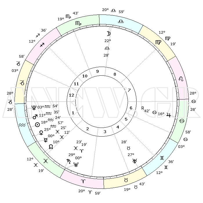 | | ΘΕΣΕΙΣ ΠΛΑΝΗΤΩΝ ΑΣΤΡΟΛΟΓΙΚΟΥ ΧΑΡΤΗ ΤΗΣ ΣΤΙΓΜΗΣ ΑΥΤΗΣ | | | | Πλανήτης | Ζώδιο | Μοίρες | Δεκαήμ. | Σε οίκο | Απόκλιση | | Ακμές των οίκων | | Ηλιος | Υδροχόος | 18°15' | Δεύτερο | 2 | 15 S 21 | | 1ος | 09°33' | Τοξότης | | Σελήνη | Ζυγός | 20°43' | Τρίτο | 10 | 11 S 19 | | 2ος | 12°11' | Αιγόκερως | | Ερμής | Ιχθείς | 00°11' | Πρώτο | 3 | 12 S 39 | | 3ος | 19°30' | Υδροχόος | | Αφροδίτη | Υδροχόος | 25°46' | Τρίτο | 3 | 14 S 17 | | 4ος | 25°31' | Ιχθείς | | Αρης | Υδροχόος | 11°28' | Δεύτερο | 2 | 18 S 21 | | 5ος | 25°12' | Κριός | | Δίας | Καρκίνος | 16°43'R | Δεύτερο | 8 | 22 N 42 | | 6ος | 18°60' | Ταύρος | | Κρόνος | Ιχθείς | 29°22' | Τρίτο | 4 | 02 S 14 | | 7ος | 09°33' | Δίδυμοι | | Ουρανός | Ταύρος | 27°28' | Τρίτο | 6 | 19 N 24 | | 8ος | 12°11' | Καρκίνος | | Ποσειδώνας | Κριός | 00°19' | Πρώτο | 4 | 01 S 05 | | 9ος | 19°30' | Λέων | | Πλούτωνας | Υδροχόος | 03°53' | Πρώτο | 2 | 22 S 59 | | 10ος | 25°31' | Παρθένος | | Β. Δεσμός | Ιχθείς | 10°12' | Δεύτερο | 3 | 07 S 44 | | 11ος | 25°12' | Ζυγός | | Ωροσκόπος | Τοξότης | 09°33' | Πρώτο | | | 12ος | 18°60' | Σκορπιός | | Μεσουράνημα | Παρθένος | 25°31' | Τρίτο | | | |