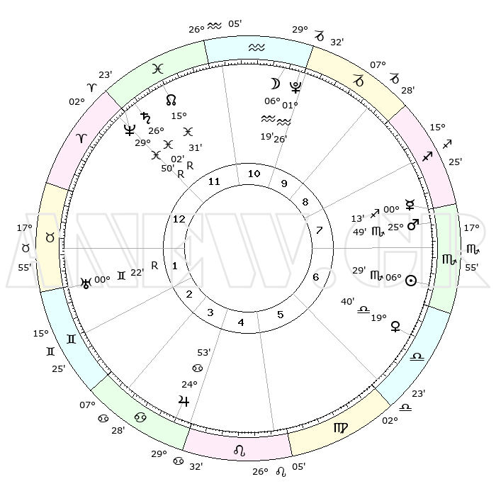 | | ΘΕΣΕΙΣ ΠΛΑΝΗΤΩΝ ΑΣΤΡΟΛΟΓΙΚΟΥ ΧΑΡΤΗ ΤΗΣ ΣΤΙΓΜΗΣ ΑΥΤΗΣ | | | | Πλανήτης | Ζώδιο | Μοίρες | Δεκαήμ. | Σε οίκο | Απόκλιση | | Ακμές των οίκων | | Ηλιος | Σκορπιός | 06°23' | Πρώτο | 8 | 13 S 39 | | 1ος | 22°24' | Ιχθείς | | Σελήνη | Υδροχόος | 05°02' | Πρώτο | 11 | 22 S 20 | | 2ος | 04°26' | Ταύρος | | Ερμής | Τοξότης | 00°07' | Πρώτο | 8 | 22 S 57 | | 3ος | 03°03' | Δίδυμοι | | Αφροδίτη | Ζυγός | 19°32' | Δεύτερο | 7 | 06 S 15 | | 4ος | 25°44' | Δίδυμοι | | Αρης | Σκορπιός | 25°45' | Τρίτο | 8 | 19 S 33 | | 5ος | 17°45' | Καρκίνος | | Δίας | Καρκίνος | 24°52' | Τρίτο | 5 | 21 N 14 | | 6ος | 14°02' | Λέων | | Κρόνος | Ιχθείς | 26°02'R | Τρίτο | 1 | 03 S 51 | | 7ος | 22°24' | Παρθένος | | Ουρανός | Δίδυμοι | 00°22'R | Πρώτο | 2 | 20 N 01 | | 8ος | 04°26' | Σκορπιός | | Ποσειδώνας | Ιχθείς | 29°50'R | Τρίτο | 1 | 01 S 19 | | 9ος | 03°03' | Τοξότης | | Πλούτωνας | Υδροχόος | 01°25' | Πρώτο | 11 | 23 S 31 | | 10ος | 25°44' | Τοξότης | | Β. Δεσμός | Ιχθείς | 15°32' | Δεύτερο | 12 | 05 S 42 | | 11ος | 17°45' | Αιγόκερως | | Ωροσκόπος | Ιχθείς | 22°24' | Τρίτο | | | 12ος | 14°02' | Υδροχόος | | Μεσουράνημα | Τοξότης | 25°44' | Τρίτο | | | |