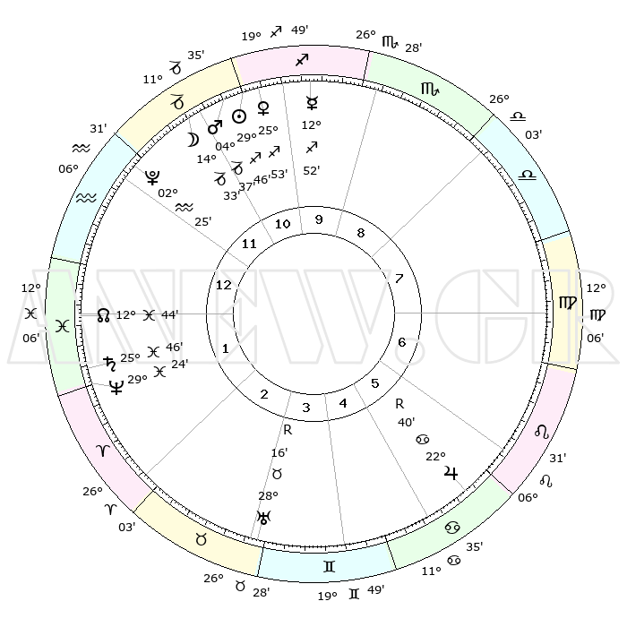 | | ΘΕΣΕΙΣ ΠΛΑΝΗΤΩΝ ΑΣΤΡΟΛΟΓΙΚΟΥ ΧΑΡΤΗ ΤΗΣ ΣΤΙΓΜΗΣ ΑΥΤΗΣ | | | | Πλανήτης | Ζώδιο | Μοίρες | Δεκαήμ. | Σε οίκο | Απόκλιση | | Ακμές των οίκων | | Ηλιος | Τοξότης | 29°42' | Τρίτο | 11 | 23 S 26 | | 1ος | 02°24' | Υδροχόος | | Σελήνη | Αιγόκερως | 13°35' | Δεύτερο | 12 | 26 S 59 | | 2ος | 16°53' | Ιχθείς | | Ερμής | Τοξότης | 12°46' | Δεύτερο | 10 | 21 S 36 | | 3ος | 24°56' | Κριός | | Αφροδίτη | Τοξότης | 25°47' | Τρίτο | 11 | 23 S 27 | | 4ος | 22°60' | Ταύρος | | Αρης | Αιγόκερως | 04°33' | Πρώτο | 11 | 24 S 10 | | 5ος | 15°35' | Δίδυμοι | | Δίας | Καρκίνος | 22°41'R | Τρίτο | 6 | 21 N 44 | | 6ος | 07°06' | Καρκίνος | | Κρόνος | Ιχθείς | 25°45' | Τρίτο | 2 | 03 S 48 | | 7ος | 02°24' | Λέων | | Ουρανός | Ταύρος | 28°16'R | Τρίτο | 4 | 19 N 34 | | 8ος | 16°53' | Παρθένος | | Ποσειδώνας | Ιχθείς | 29°24' | Τρίτο | 2 | 01 S 28 | | 9ος | 24°56' | Ζυγός | | Πλούτωνας | Υδροχόος | 02°25' | Πρώτο | 1 | 23 S 17 | | 10ος | 22°60' | Σκορπιός | | Β. Δεσμός | Ιχθείς | 12°44' | Δεύτερο | 1 | 06 S 47 | | 11ος | 15°35' | Τοξότης | | Ωροσκόπος | Υδροχόος | 02°24' | Πρώτο | | | 12ος | 07°06' | Αιγόκερως | | Μεσουράνημα | Σκορπιός | 22°60' | Τρίτο | | | |
