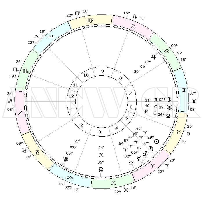| | ΘΕΣΕΙΣ ΠΛΑΝΗΤΩΝ ΑΣΤΡΟΛΟΓΙΚΟΥ ΧΑΡΤΗ ΤΗΣ ΣΤΙΓΜΗΣ ΑΥΤΗΣ | | | | Πλανήτης | Ζώδιο | Μοίρες | Δεκαήμ. | Σε οίκο | Απόκλιση | | Ακμές των οίκων | | Ηλιος | Κριός | 29°43' | Τρίτο | 6 | 11 N 22 | | 1ος | 16°24' | Σκορπιός | | Σελήνη | Δίδυμοι | 01°17' | Πρώτο | 7 | 25 N 22 | | 2ος | 16°01' | Τοξότης | | Ερμής | Κριός | 06°50' | Πρώτο | 5 | 00 N 18 | | 3ος | 19°40' | Αιγόκερως | | Αφροδίτη | Ταύρος | 24°39' | Τρίτο | 7 | 19 N 18 | | 4ος | 25°03' | Υδροχόος | | Αρης | Κριός | 07°44' | Πρώτο | 5 | 02 N 11 | | 5ος | 27°23' | Ιχθείς | | Δίας | Καρκίνος | 17°29' | Δεύτερο | 8 | 22 N 40 | | 6ος | 24°15' | Κριός | | Κρόνος | Κριός | 07°57' | Πρώτο | 5 | 01 N 11 | | 7ος | 16°24' | Ταύρος | | Ουρανός | Ταύρος | 29°40' | Τρίτο | 7 | 19 N 55 | | 8ος | 16°01' | Δίδυμοι | | Ποσειδώνας | Κριός | 02°53' | Πρώτο | 5 | 00 S 03 | | 9ος | 19°40' | Καρκίνος | | Πλούτωνας | Υδροχόος | 05°27' | Πρώτο | 3 | 22 S 48 | | 10ος | 25°03' | Λέων | | Β. Δεσμός | Ιχθείς | 06°25' | Πρώτο | 4 | 09 S 09 | | 11ος | 27°23' | Παρθένος | | Ωροσκόπος | Σκορπιός | 16°24' | Δεύτερο | | | 12ος | 24°15' | Ζυγός | | Μεσουράνημα | Λέων | 25°03' | Τρίτο | | | |