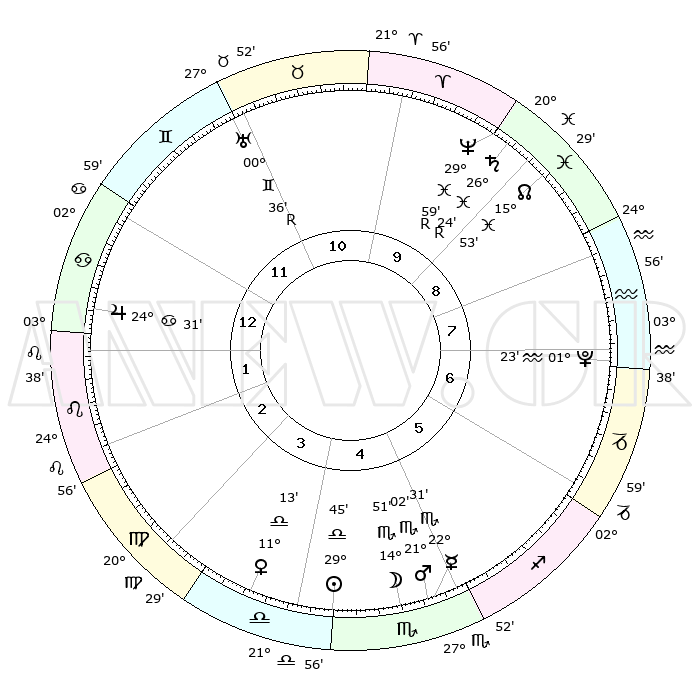 | ΘΕΣΕΙΣ ΠΛΑΝΗΤΩΝ ΑΣΤΡΟΛΟΓΙΚΟΥ ΧΑΡΤΗ ΤΗΣ ΣΤΙΓΜΗΣ ΑΥΤΗΣ | | Πλανήτης | Ζώδιο | Μοίρες | Δεκαήμ. | Σε οίκο | Απόκλιση | | Ακμές των οίκων | Ηλιος | Ζυγός | 29°38' | Τρίτο | 5 | 11 S 20 | | 1ος | 00°36' | Καρκίνος | Σελήνη | Σκορπιός | 13°34' | Δεύτερο | 5 | 19 S 58 | | 2ος | 21°22' | Καρκίνος | Ερμής | Σκορπιός | 22°23' | Τρίτο | 5 | 20 S 45 | | 3ος | 13°12' | Λέων | Αφροδίτη | Ζυγός | 11°05' | Δεύτερο | 4 | 02 S 58 | | 4ος | 09°37' | Παρθένος | Αρης | Σκορπιός | 20°58' | Τρίτο | 5 | 18 S 17 | | 5ος | 13°39' | Ζυγός | Δίας | Καρκίνος | 24°31' | Τρίτο | 2 | 21 N 17 | | 6ος | 23°36' | Σκορπιός | Κρόνος | Ιχθείς | 26°24'R | Τρίτο | 10 | 03 S 43 | | 7ος | 00°36' | Αιγόκερως | Ουρανός | Δίδυμοι | 00°36'R | Πρώτο | 12 | 20 N 04 | | 8ος | 21°22' | Αιγόκερως | Ποσειδώνας | Ιχθείς | 29°59'R | Τρίτο | 10 | 01 S 16 | | 9ος | 13°12' | Υδροχόος | Πλούτωνας | Υδροχόος | 01°23' | Πρώτο | 8 | 23 S 32 | | 10ος | 09°37' | Ιχθείς | Β. Δεσμός | Ιχθείς | 15°53' | Δεύτερο | 10 | 05 S 34 | | 11ος | 13°39' | Κριός | Ωροσκόπος | Καρκίνος | 00°36' | Πρώτο | | | 12ος | 23°36' | Ταύρος | Μεσουράνημα | Ιχθείς | 09°37' | Πρώτο | | | |