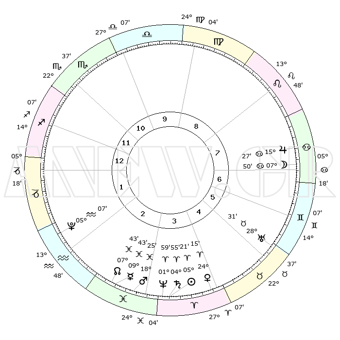 | | ΘΕΣΕΙΣ ΠΛΑΝΗΤΩΝ ΑΣΤΡΟΛΟΓΙΚΟΥ ΧΑΡΤΗ ΤΗΣ ΣΤΙΓΜΗΣ ΑΥΤΗΣ | | | | Πλανήτης | Ζώδιο | Μοίρες | Δεκαήμ. | Σε οίκο | Απόκλιση | | Ακμές των οίκων | | Ηλιος | Κριός | 05°16' | Πρώτο | 4 | 02 N 06 | | 1ος | 12°26' | Τοξότης | | Σελήνη | Καρκίνος | 06°49' | Πρώτο | 7 | 27 N 52 | | 2ος | 15°36' | Αιγόκερως | | Ερμής | Ιχθείς | 09°41' | Πρώτο | 3 | 08 S 06 | | 3ος | 23°24' | Υδροχόος | | Αφροδίτη | Κριός | 24°09' | Τρίτο | 4 | 08 N 44 | | 4ος | 29°17' | Ιχθείς | | Αρης | Ιχθείς | 18°22' | Δεύτερο | 3 | 05 S 35 | | 5ος | 28°30' | Κριός | | Δίας | Καρκίνος | 15°26' | Δεύτερο | 7 | 22 N 54 | | 6ος | 21°57' | Ταύρος | | Κρόνος | Κριός | 04°54' | Πρώτο | 4 | 00 S 00 | | 7ος | 12°26' | Δίδυμοι | | Ουρανός | Ταύρος | 28°31' | Τρίτο | 6 | 19 N 39 | | 8ος | 15°36' | Καρκίνος | | Ποσειδώνας | Κριός | 01°59' | Πρώτο | 4 | 00 S 25 | | 9ος | 23°24' | Λέων | | Πλούτωνας | Υδροχόος | 05°07' | Πρώτο | 2 | 22 S 48 | | 10ος | 29°17' | Παρθένος | | Β. Δεσμός | Ιχθείς | 07°44' | Πρώτο | 3 | 08 S 40 | | 11ος | 28°30' | Ζυγός | | Ωροσκόπος | Τοξότης | 12°26' | Δεύτερο | | | 12ος | 21°57' | Σκορπιός | | Μεσουράνημα | Παρθένος | 29°17' | Τρίτο | | | |