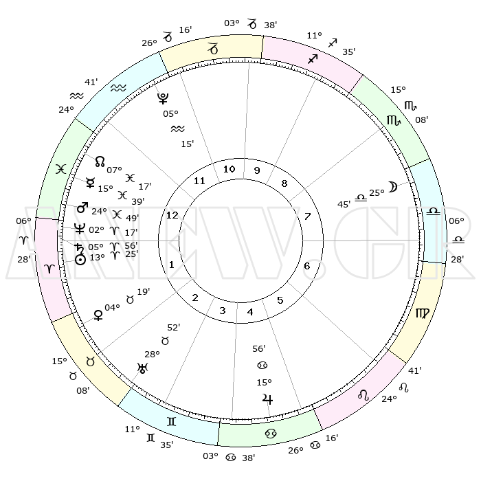 | | ΘΕΣΕΙΣ ΠΛΑΝΗΤΩΝ ΑΣΤΡΟΛΟΓΙΚΟΥ ΧΑΡΤΗ ΤΗΣ ΣΤΙΓΜΗΣ ΑΥΤΗΣ | | | | Πλανήτης | Ζώδιο | Μοίρες | Δεκαήμ. | Σε οίκο | Απόκλιση | | Ακμές των οίκων | | Ηλιος | Κριός | 13°21' | Δεύτερο | 1 | 05 N 16 | | 1ος | 27°53' | Υδροχόος | | Σελήνη | Ζυγός | 24°55' | Τρίτο | 8 | 13 S 08 | | 2ος | 13°27' | Κριός | | Ερμής | Ιχθείς | 15°35' | Δεύτερο | 1 | 07 S 10 | | 3ος | 16°35' | Ταύρος | | Αφροδίτη | Ταύρος | 04°14' | Πρώτο | 2 | 12 N 35 | | 4ος | 11°12' | Δίδυμοι | | Αρης | Ιχθείς | 24°46' | Τρίτο | 1 | 03 S 02 | | 5ος | 02°54' | Καρκίνος | | Δίας | Καρκίνος | 15°55' | Δεύτερο | 5 | 22 N 51 | | 6ος | 26°15' | Καρκίνος | | Κρόνος | Κριός | 05°55' | Πρώτο | 1 | 00 N 24 | | 7ος | 27°53' | Λέων | | Ουρανός | Ταύρος | 28°51' | Τρίτο | 3 | 19 N 44 | | 8ος | 13°27' | Ζυγός | | Ποσειδώνας | Κριός | 02°17' | Πρώτο | 1 | 00 S 17 | | 9ος | 16°35' | Σκορπιός | | Πλούτωνας | Υδροχόος | 05°15' | Πρώτο | 12 | 22 S 47 | | 10ος | 11°12' | Τοξότης | | Β. Δεσμός | Ιχθείς | 07°18' | Πρώτο | 1 | 08 S 50 | | 11ος | 02°54' | Αιγόκερως | | Ωροσκόπος | Υδροχόος | 27°53' | Τρίτο | | | 12ος | 26°15' | Αιγόκερως | | Μεσουράνημα | Τοξότης | 11°12' | Δεύτερο | | | |