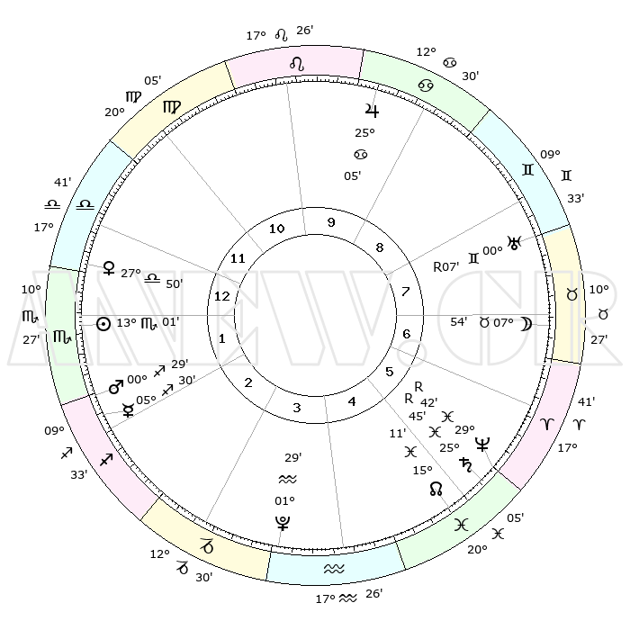 | | ΘΕΣΕΙΣ ΠΛΑΝΗΤΩΝ ΑΣΤΡΟΛΟΓΙΚΟΥ ΧΑΡΤΗ ΤΗΣ ΣΤΙΓΜΗΣ ΑΥΤΗΣ | | | | Πλανήτης | Ζώδιο | Μοίρες | Δεκαήμ. | Σε οίκο | Απόκλιση | | Ακμές των οίκων | | Ηλιος | Σκορπιός | 12°48' | Δεύτερο | 3 | 15 S 41 | | 1ος | 05°18' | Παρθένος | | Σελήνη | Ταύρος | 04°31' | Πρώτο | 9 | 16 N 34 | | 2ος | 29°42' | Παρθένος | | Ερμής | Τοξότης | 05°22' | Πρώτο | 4 | 23 S 58 | | 3ος | 28°49' | Ζυγός | | Αφροδίτη | Ζυγός | 27°33' | Τρίτο | 2 | 09 S 17 | | 4ος | 01°46' | Τοξότης | | Αρης | Τοξότης | 00°19' | Πρώτο | 3 | 20 S 38 | | 5ος | 05°37' | Αιγόκερως | | Δίας | Καρκίνος | 25°05' | Τρίτο | 11 | 21 N 12 | | 6ος | 07°12' | Υδροχόος | | Κρόνος | Ιχθείς | 25°45'R | Τρίτο | 7 | 03 S 56 | | 7ος | 05°18' | Ιχθείς | | Ουρανός | Δίδυμοι | 00°07'R | Πρώτο | 9 | 19 N 58 | | 8ος | 29°42' | Ιχθείς | | Ποσειδώνας | Ιχθείς | 29°43'R | Τρίτο | 8 | 01 S 22 | | 9ος | 28°49' | Κριός | | Πλούτωνας | Υδροχόος | 01°29' | Πρώτο | 5 | 23 S 30 | | 10ος | 01°46' | Δίδυμοι | | Β. Δεσμός | Ιχθείς | 15°11' | Δεύτερο | 7 | 05 S 50 | | 11ος | 05°37' | Καρκίνος | | Ωροσκόπος | Παρθένος | 05°18' | Πρώτο | | | 12ος | 07°12' | Λέων | | Μεσουράνημα | Δίδυμοι | 01°46' | Πρώτο | | | |