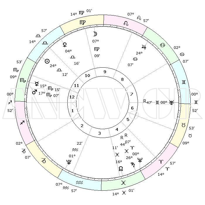 | ΘΕΣΕΙΣ ΠΛΑΝΗΤΩΝ ΑΣΤΡΟΛΟΓΙΚΟΥ ΧΑΡΤΗ ΤΗΣ ΣΤΙΓΜΗΣ ΑΥΤΗΣ | | Πλανήτης | Ζώδιο | Μοίρες | Δεκαήμ. | Σε οίκο | Απόκλιση | | Ακμές των οίκων | Ηλιος | Ζυγός | 23°45' | Τρίτο | 4 | 09 S 13 | | 1ος | 17°43' | Καρκίνος | Σελήνη | Παρθένος | 01°25' | Πρώτο | 2 | 12 N 22 | | 2ος | 08°11' | Λέων | Ερμής | Σκορπιός | 14°38' | Δεύτερο | 5 | 18 S 04 | | 3ος | 01°39' | Παρθένος | Αφροδίτη | Ζυγός | 03°42' | Πρώτο | 4 | 00 S 05 | | 4ος | 00°54' | Ζυγός | Αρης | Σκορπιός | 16°48' | Δεύτερο | 5 | 17 S 05 | | 5ος | 06°47' | Σκορπιός | Δίας | Καρκίνος | 24°05' | Τρίτο | 1 | 21 N 20 | | 6ος | 14°34' | Τοξότης | Κρόνος | Ιχθείς | 26°46'R | Τρίτο | 9 | 03 S 35 | | 7ος | 17°43' | Αιγόκερως | Ουρανός | Δίδυμοι | 00°48'R | Πρώτο | 11 | 20 N 06 | | 8ος | 08°11' | Υδροχόος | Ποσειδώνας | Κριός | 00°08'R | Πρώτο | 9 | 01 S 12 | | 9ος | 01°39' | Ιχθείς | Πλούτωνας | Υδροχόος | 01°22' | Πρώτο | 7 | 23 S 32 | | 10ος | 00°54' | Κριός | Β. Δεσμός | Ιχθείς | 16°12' | Δεύτερο | 9 | 05 S 27 | | 11ος | 06°47' | Ταύρος | Ωροσκόπος | Καρκίνος | 17°43' | Δεύτερο | | | 12ος | 14°34' | Δίδυμοι | Μεσουράνημα | Κριός | 00°54' | Πρώτο | | | |