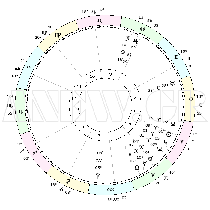 | | ΘΕΣΕΙΣ ΠΛΑΝΗΤΩΝ ΑΣΤΡΟΛΟΓΙΚΟΥ ΧΑΡΤΗ ΤΗΣ ΣΤΙΓΜΗΣ ΑΥΤΗΣ | | | | Πλανήτης | Ζώδιο | Μοίρες | Δεκαήμ. | Σε οίκο | Απόκλιση | | Ακμές των οίκων | | Ηλιος | Κριός | 06°06' | Πρώτο | 6 | 02 N 25 | | 1ος | 22°56' | Ζυγός | | Σελήνη | Καρκίνος | 18°24' | Δεύτερο | 9 | 26 N 10 | | 2ος | 20°57' | Σκορπιός | | Ερμής | Ιχθείς | 10°05' | Δεύτερο | 5 | 08 S 07 | | 3ος | 22°24' | Τοξότης | | Αφροδίτη | Κριός | 25°11' | Τρίτο | 7 | 09 N 08 | | 4ος | 26°09' | Αιγόκερως | | Αρης | Ιχθείς | 19°01' | Δεύτερο | 5 | 05 S 19 | | 5ος | 29°06' | Υδροχόος | | Δίας | Καρκίνος | 15°29' | Δεύτερο | 9 | 22 N 54 | | 6ος | 28°21' | Ιχθείς | | Κρόνος | Κριός | 05°00' | Πρώτο | 6 | 00 N 02 | | 7ος | 22°56' | Κριός | | Ουρανός | Ταύρος | 28°33' | Τρίτο | 8 | 19 N 40 | | 8ος | 20°57' | Ταύρος | | Ποσειδώνας | Κριός | 02°01' | Πρώτο | 6 | 00 S 24 | | 9ος | 22°24' | Δίδυμοι | | Πλούτωνας | Υδροχόος | 05°08' | Πρώτο | 4 | 22 S 48 | | 10ος | 26°09' | Καρκίνος | | Β. Δεσμός | Ιχθείς | 07°41' | Πρώτο | 5 | 08 S 41 | | 11ος | 29°06' | Λέων | | Ωροσκόπος | Ζυγός | 22°56' | Τρίτο | | | 12ος | 28°21' | Παρθένος | | Μεσουράνημα | Καρκίνος | 26°09' | Τρίτο | | | |