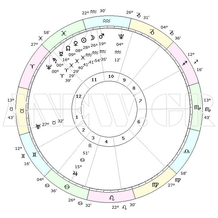 | | ΘΕΣΕΙΣ ΠΛΑΝΗΤΩΝ ΑΣΤΡΟΛΟΓΙΚΟΥ ΧΑΡΤΗ ΤΗΣ ΣΤΙΓΜΗΣ ΑΥΤΗΣ | | | | Πλανήτης | Ζώδιο | Μοίρες | Δεκαήμ. | Σε οίκο | Απόκλιση | | Ακμές των οίκων | | Ηλιος | Υδροχόος | 28°36' | Τρίτο | 12 | 11 S 57 | | 1ος | 00°21' | Κριός | | Σελήνη | Υδροχόος | 25°53' | Τρίτο | 12 | 14 S 01 | | 2ος | 10°34' | Ταύρος | | Ερμής | Ιχθείς | 16°23' | Δεύτερο | 12 | 04 S 51 | | 3ος | 07°55' | Δίδυμοι | | Αφροδίτη | Ιχθείς | 08°35' | Πρώτο | 12 | 09 S 42 | | 4ος | 00°12' | Καρκίνος | | Αρης | Υδροχόος | 19°31' | Δεύτερο | 11 | 15 S 59 | | 5ος | 22°31' | Καρκίνος | | Δίας | Καρκίνος | 15°52'R | Δεύτερο | 4 | 22 N 49 | | 6ος | 19°59' | Λέων | | Κρόνος | Κριός | 00°29' | Πρώτο | 1 | 01 S 47 | | 7ος | 00°21' | Ζυγός | | Ουρανός | Ταύρος | 27°32' | Τρίτο | 2 | 19 N 26 | | 8ος | 10°34' | Σκορπιός | | Ποσειδώνας | Κριός | 00°39' | Πρώτο | 1 | 00 S 57 | | 9ος | 07°55' | Τοξότης | | Πλούτωνας | Υδροχόος | 04°12' | Πρώτο | 11 | 22 S 56 | | 10ος | 00°12' | Αιγόκερως | | Β. Δεσμός | Ιχθείς | 09°40' | Πρώτο | 12 | 07 S 57 | | 11ος | 22°31' | Αιγόκερως | | Ωροσκόπος | Κριός | 00°21' | Πρώτο | | | 12ος | 19°59' | Υδροχόος | | Μεσουράνημα | Αιγόκερως | 00°12' | Πρώτο | | | |