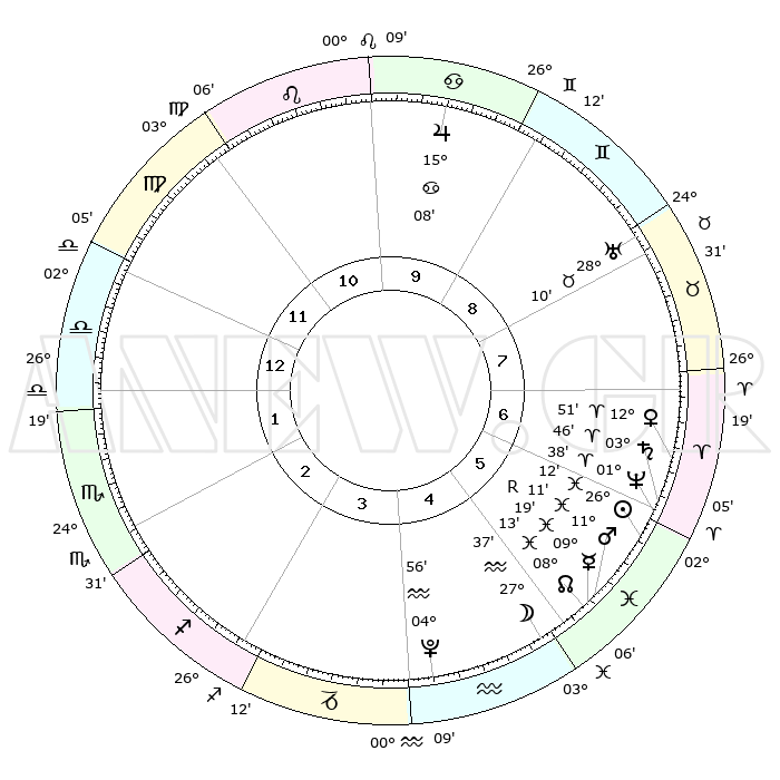 | | ΘΕΣΕΙΣ ΠΛΑΝΗΤΩΝ ΑΣΤΡΟΛΟΓΙΚΟΥ ΧΑΡΤΗ ΤΗΣ ΣΤΙΓΜΗΣ ΑΥΤΗΣ | | | | Πλανήτης | Ζώδιο | Μοίρες | Δεκαήμ. | Σε οίκο | Απόκλιση | | Ακμές των οίκων | | Ηλιος | Ιχθείς | 26°09' | Τρίτο | 6 | 01 S 32 | | 1ος | 09°01' | Ζυγός | | Σελήνη | Υδροχόος | 26°51' | Τρίτο | 5 | 13 S 36 | | 2ος | 06°12' | Σκορπιός | | Ερμής | Ιχθείς | 09°21'R | Πρώτο | 5 | 06 S 13 | | 3ος | 06°59' | Τοξότης | | Αφροδίτη | Κριός | 12°47' | Δεύτερο | 7 | 04 N 08 | | 4ος | 10°08' | Αιγόκερως | | Αρης | Ιχθείς | 11°09' | Δεύτερο | 5 | 08 S 23 | | 5ος | 13°04' | Υδροχόος | | Δίας | Καρκίνος | 15°08' | Δεύτερο | 10 | 22 N 56 | | 6ος | 13°08' | Ιχθείς | | Κρόνος | Κριός | 03°45' | Πρώτο | 6 | 00 S 27 | | 7ος | 09°01' | Κριός | | Ουρανός | Ταύρος | 28°10' | Τρίτο | 8 | 19 N 35 | | 8ος | 06°12' | Ταύρος | | Ποσειδώνας | Κριός | 01°38' | Πρώτο | 6 | 00 S 33 | | 9ος | 06°59' | Δίδυμοι | | Πλούτωνας | Υδροχόος | 04°55' | Πρώτο | 4 | 22 S 49 | | 10ος | 10°08' | Καρκίνος | | Β. Δεσμός | Ιχθείς | 08°13' | Πρώτο | 5 | 08 S 29 | | 11ος | 13°04' | Λέων | | Ωροσκόπος | Ζυγός | 09°01' | Πρώτο | | | 12ος | 13°08' | Παρθένος | | Μεσουράνημα | Καρκίνος | 10°08' | Δεύτερο | | | |