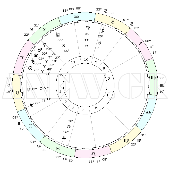 | | ΘΕΣΕΙΣ ΠΛΑΝΗΤΩΝ ΑΣΤΡΟΛΟΓΙΚΟΥ ΧΑΡΤΗ ΤΗΣ ΣΤΙΓΜΗΣ ΑΥΤΗΣ | | | | Πλανήτης | Ζώδιο | Μοίρες | Δεκαήμ. | Σε οίκο | Απόκλιση | | Ακμές των οίκων | | Ηλιος | Κριός | 20°16' | Τρίτο | 1 | 07 N 55 | | 1ος | 23°60' | Ιχθείς | | Σελήνη | Αιγόκερως | 19°23' | Δεύτερο | 11 | 25 S 53 | | 2ος | 05°40' | Ταύρος | | Ερμής | Ιχθείς | 23°21' | Τρίτο | 12 | 04 S 48 | | 3ος | 04°02' | Δίδυμοι | | Αφροδίτη | Ταύρος | 12°51' | Δεύτερο | 2 | 15 N 39 | | 4ος | 26°38' | Δίδυμοι | | Αρης | Κριός | 00°15' | Πρώτο | 1 | 00 S 50 | | 5ος | 18°42' | Καρκίνος | | Δίας | Καρκίνος | 16°30' | Δεύτερο | 4 | 22 N 47 | | 6ος | 15°12' | Λέων | | Κρόνος | Κριός | 06°47' | Πρώτο | 1 | 00 N 44 | | 7ος | 23°60' | Παρθένος | | Ουρανός | Ταύρος | 29°11' | Τρίτο | 2 | 19 N 48 | | 8ος | 05°40' | Σκορπιός | | Ποσειδώνας | Κριός | 02°33' | Πρώτο | 1 | 00 S 11 | | 9ος | 04°02' | Τοξότης | | Πλούτωνας | Υδροχόος | 05°21' | Πρώτο | 11 | 22 S 47 | | 10ος | 26°38' | Τοξότης | | Β. Δεσμός | Ιχθείς | 06°55' | Πρώτο | 12 | 08 S 58 | | 11ος | 18°42' | Αιγόκερως | | Ωροσκόπος | Ιχθείς | 23°60' | Τρίτο | | | 12ος | 15°12' | Υδροχόος | | Μεσουράνημα | Τοξότης | 26°38' | Τρίτο | | | |