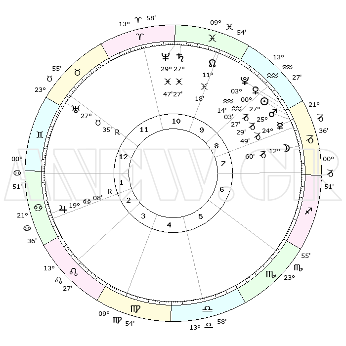 | | ΘΕΣΕΙΣ ΠΛΑΝΗΤΩΝ ΑΣΤΡΟΛΟΓΙΚΟΥ ΧΑΡΤΗ ΤΗΣ ΣΤΙΓΜΗΣ ΑΥΤΗΣ | | | | Πλανήτης | Ζώδιο | Μοίρες | Δεκαήμ. | Σε οίκο | Απόκλιση | | Ακμές των οίκων | | Ηλιος | Αιγόκερως | 27°22' | Τρίτο | 9 | 20 S 41 | | 1ος | 03°08' | Δίδυμοι | | Σελήνη | Αιγόκερως | 12°04' | Δεύτερο | 8 | 27 S 12 | | 2ος | 27°20' | Δίδυμοι | | Ερμής | Αιγόκερως | 24°41' | Τρίτο | 9 | 23 S 04 | | 3ος | 18°39' | Καρκίνος | | Αφροδίτη | Αιγόκερως | 29°57' | Τρίτο | 9 | 21 S 11 | | 4ος | 11°39' | Λέων | | Αρης | Αιγόκερως | 25°25' | Τρίτο | 9 | 22 S 01 | | 5ος | 10°40' | Παρθένος | | Δίας | Καρκίνος | 19°09'R | Δεύτερο | 3 | 22 N 20 | | 6ος | 19°35' | Ζυγός | | Κρόνος | Ιχθείς | 27°27' | Τρίτο | 11 | 03 S 03 | | 7ος | 03°08' | Τοξότης | | Ουρανός | Ταύρος | 27°35'R | Τρίτο | 12 | 19 N 26 | | 8ος | 27°20' | Τοξότης | | Ποσειδώνας | Ιχθείς | 29°47' | Τρίτο | 11 | 01 S 18 | | 9ος | 18°39' | Αιγόκερως | | Πλούτωνας | Υδροχόος | 03°14' | Πρώτο | 9 | 23 S 07 | | 10ος | 11°39' | Υδροχόος | | Β. Δεσμός | Ιχθείς | 11°18' | Δεύτερο | 11 | 07 S 20 | | 11ος | 10°40' | Ιχθείς | | Ωροσκόπος | Δίδυμοι | 03°08' | Πρώτο | | | 12ος | 19°35' | Κριός | | Μεσουράνημα | Υδροχόος | 11°39' | Δεύτερο | | | |