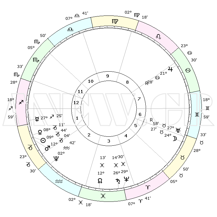 | | ΘΕΣΕΙΣ ΠΛΑΝΗΤΩΝ ΑΣΤΡΟΛΟΓΙΚΟΥ ΧΑΡΤΗ ΤΗΣ ΣΤΙΓΜΗΣ ΑΥΤΗΣ | | | | Πλανήτης | Ζώδιο | Μοίρες | Δεκαήμ. | Σε οίκο | Απόκλιση | | Ακμές των οίκων | | Ηλιος | Αιγόκερως | 09°34' | Πρώτο | 3 | 23 S 05 | | 1ος | 03°02' | Σκορπιός | | Σελήνη | Ταύρος | 22°08' | Τρίτο | 7 | 22 N 56 | | 2ος | 01°38' | Τοξότης | | Ερμής | Τοξότης | 27°10' | Τρίτο | 2 | 23 S 52 | | 3ος | 03°50' | Αιγόκερως | | Αφροδίτη | Αιγόκερως | 07°59' | Πρώτο | 3 | 23 S 40 | | 4ος | 08°14' | Υδροχόος | | Αρης | Αιγόκερως | 11°57' | Δεύτερο | 3 | 23 S 47 | | 5ος | 11°06' | Ιχθείς | | Δίας | Καρκίνος | 21°29'R | Τρίτο | 9 | 21 N 57 | | 6ος | 09°30' | Κριός | | Κρόνος | Ιχθείς | 26°14' | Τρίτο | 5 | 03 S 35 | | 7ος | 03°02' | Ταύρος | | Ουρανός | Ταύρος | 27°58'R | Τρίτο | 7 | 19 N 31 | | 8ος | 01°38' | Δίδυμοι | | Ποσειδώνας | Ιχθείς | 29°30' | Τρίτο | 5 | 01 S 25 | | 9ος | 03°50' | Καρκίνος | | Πλούτωνας | Υδροχόος | 02°42' | Πρώτο | 3 | 23 S 14 | | 10ος | 08°14' | Λέων | | Β. Δεσμός | Ιχθείς | 12°13' | Δεύτερο | 5 | 06 S 58 | | 11ος | 11°06' | Παρθένος | | Ωροσκόπος | Σκορπιός | 03°02' | Πρώτο | | | 12ος | 09°30' | Ζυγός | | Μεσουράνημα | Λέων | 08°14' | Πρώτο | | | |