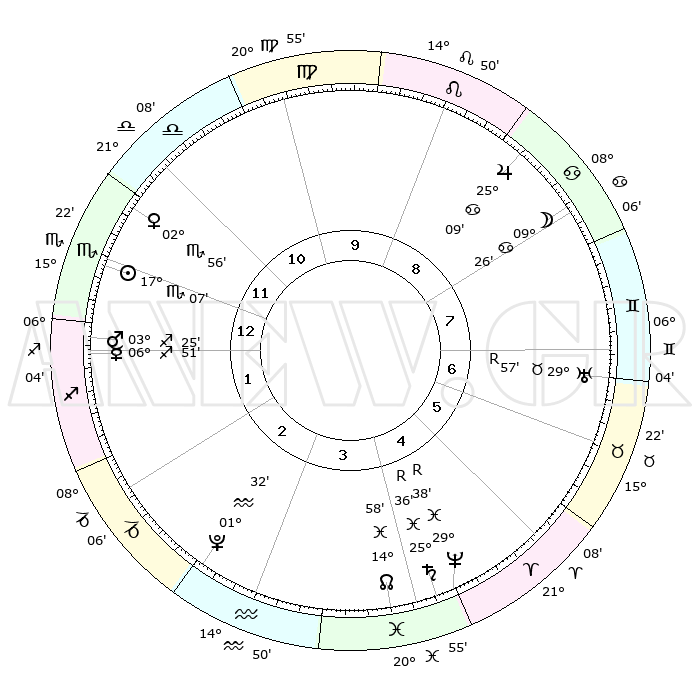 | | ΘΕΣΕΙΣ ΠΛΑΝΗΤΩΝ ΑΣΤΡΟΛΟΓΙΚΟΥ ΧΑΡΤΗ ΤΗΣ ΣΤΙΓΜΗΣ ΑΥΤΗΣ | | | | Πλανήτης | Ζώδιο | Μοίρες | Δεκαήμ. | Σε οίκο | Απόκλιση | | Ακμές των οίκων | | Ηλιος | Σκορπιός | 17°02' | Δεύτερο | 1 | 16 S 55 | | 1ος | 13°36' | Σκορπιός | | Σελήνη | Καρκίνος | 08°19' | Πρώτο | 8 | 27 N 52 | | 2ος | 12°58' | Τοξότης | | Ερμής | Τοξότης | 06°50' | Πρώτο | 1 | 23 S 51 | | 3ος | 16°16' | Αιγόκερως | | Αφροδίτη | Σκορπιός | 02°50' | Πρώτο | 12 | 11 S 12 | | 4ος | 21°27' | Υδροχόος | | Αρης | Τοξότης | 03°21' | Πρώτο | 1 | 21 S 17 | | 5ος | 23°57' | Ιχθείς | | Δίας | Καρκίνος | 25°08' | Τρίτο | 9 | 21 N 12 | | 6ος | 21°10' | Κριός | | Κρόνος | Ιχθείς | 25°36'R | Τρίτο | 5 | 03 S 59 | | 7ος | 13°36' | Ταύρος | | Ουρανός | Ταύρος | 29°57'R | Τρίτο | 7 | 19 N 56 | | 8ος | 12°58' | Δίδυμοι | | Ποσειδώνας | Ιχθείς | 29°38'R | Τρίτο | 5 | 01 S 24 | | 9ος | 16°16' | Καρκίνος | | Πλούτωνας | Υδροχόος | 01°32' | Πρώτο | 3 | 23 S 29 | | 10ος | 21°27' | Λέων | | Β. Δεσμός | Ιχθείς | 14°58' | Δεύτερο | 4 | 05 S 55 | | 11ος | 23°57' | Παρθένος | | Ωροσκόπος | Σκορπιός | 13°36' | Δεύτερο | | | 12ος | 21°10' | Ζυγός | | Μεσουράνημα | Λέων | 21°27' | Τρίτο | | | |