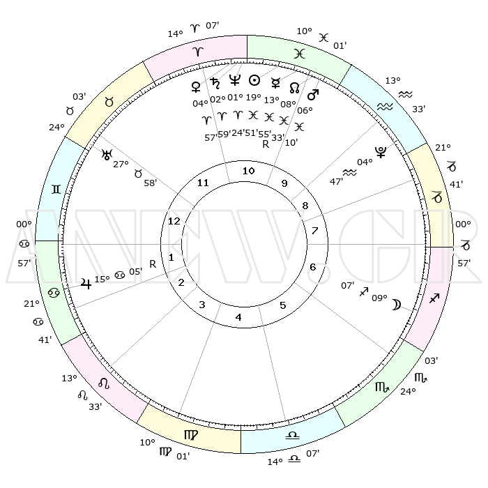 | | ΘΕΣΕΙΣ ΠΛΑΝΗΤΩΝ ΑΣΤΡΟΛΟΓΙΚΟΥ ΧΑΡΤΗ ΤΗΣ ΣΤΙΓΜΗΣ ΑΥΤΗΣ | | | | Πλανήτης | Ζώδιο | Μοίρες | Δεκαήμ. | Σε οίκο | Απόκλιση | | Ακμές των οίκων | | Ηλιος | Ιχθείς | 19°47' | Δεύτερο | 11 | 04 S 03 | | 1ος | 10°13' | Δίδυμοι | | Σελήνη | Τοξότης | 08°26' | Πρώτο | 6 | 26 S 55 | | 2ος | 03°11' | Καρκίνος | | Ερμής | Ιχθείς | 13°58'R | Δεύτερο | 10 | 03 S 13 | | 3ος | 24°23' | Καρκίνος | | Αφροδίτη | Κριός | 04°52' | Πρώτο | 11 | 00 N 52 | | 4ος | 18°04' | Λέων | | Αρης | Ιχθείς | 06°08' | Πρώτο | 10 | 10 S 17 | | 5ος | 18°23' | Παρθένος | | Δίας | Καρκίνος | 15°05'R | Δεύτερο | 2 | 22 N 56 | | 6ος | 28°08' | Ζυγός | | Κρόνος | Κριός | 02°58' | Πρώτο | 11 | 00 S 46 | | 7ος | 10°13' | Τοξότης | | Ουρανός | Ταύρος | 27°58' | Τρίτο | 12 | 19 N 32 | | 8ος | 03°11' | Αιγόκερως | | Ποσειδώνας | Κριός | 01°24' | Πρώτο | 11 | 00 S 39 | | 9ος | 24°23' | Αιγόκερως | | Πλούτωνας | Υδροχόος | 04°47' | Πρώτο | 9 | 22 S 50 | | 10ος | 18°04' | Υδροχόος | | Β. Δεσμός | Ιχθείς | 08°33' | Πρώτο | 10 | 08 S 22 | | 11ος | 18°23' | Ιχθείς | | Ωροσκόπος | Δίδυμοι | 10°13' | Δεύτερο | | | 12ος | 28°08' | Κριός | | Μεσουράνημα | Υδροχόος | 18°04' | Δεύτερο | | | |