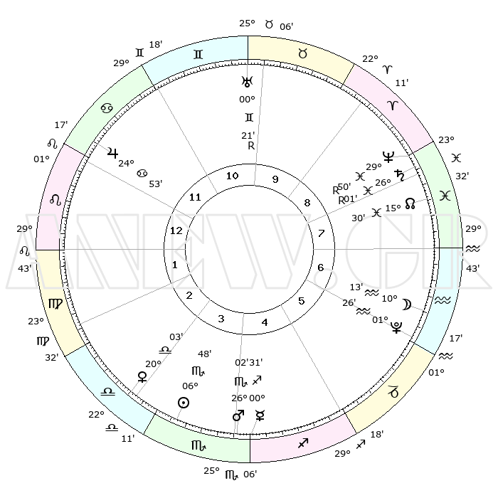 | | ΘΕΣΕΙΣ ΠΛΑΝΗΤΩΝ ΑΣΤΡΟΛΟΓΙΚΟΥ ΧΑΡΤΗ ΤΗΣ ΣΤΙΓΜΗΣ ΑΥΤΗΣ | | | | Πλανήτης | Ζώδιο | Μοίρες | Δεκαήμ. | Σε οίκο | Απόκλιση | | Ακμές των οίκων | | Ηλιος | Σκορπιός | 06°28' | Πρώτο | 6 | 13 S 40 | | 1ος | 07°60' | Ταύρος | | Σελήνη | Υδροχόος | 06°03' | Πρώτο | 10 | 22 S 01 | | 2ος | 08°03' | Δίδυμοι | | Ερμής | Τοξότης | 00°12' | Πρώτο | 7 | 22 S 59 | | 3ος | 00°51' | Καρκίνος | | Αφροδίτη | Ζυγός | 19°38' | Δεύτερο | 6 | 06 S 17 | | 4ος | 22°37' | Καρκίνος | | Αρης | Σκορπιός | 25°48' | Τρίτο | 7 | 19 S 34 | | 5ος | 17°53' | Λέων | | Δίας | Καρκίνος | 24°52' | Τρίτο | 4 | 21 N 14 | | 6ος | 22°12' | Παρθένος | | Κρόνος | Ιχθείς | 26°02'R | Τρίτο | 12 | 03 S 51 | | 7ος | 07°60' | Σκορπιός | | Ουρανός | Δίδυμοι | 00°22'R | Πρώτο | 1 | 20 N 01 | | 8ος | 08°03' | Τοξότης | | Ποσειδώνας | Ιχθείς | 29°50'R | Τρίτο | 12 | 01 S 19 | | 9ος | 00°51' | Αιγόκερως | | Πλούτωνας | Υδροχόος | 01°26' | Πρώτο | 10 | 23 S 31 | | 10ος | 22°37' | Αιγόκερως | | Β. Δεσμός | Ιχθείς | 15°31' | Δεύτερο | 11 | 05 S 42 | | 11ος | 17°53' | Υδροχόος | | Ωροσκόπος | Ταύρος | 07°60' | Πρώτο | | | 12ος | 22°12' | Ιχθείς | | Μεσουράνημα | Αιγόκερως | 22°37' | Τρίτο | | | |