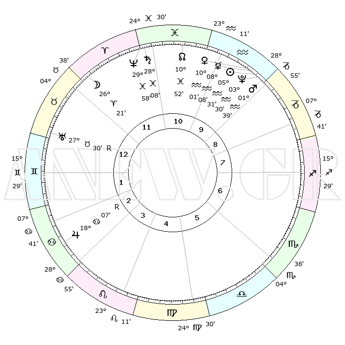 | | ΘΕΣΕΙΣ ΠΛΑΝΗΤΩΝ ΑΣΤΡΟΛΟΓΙΚΟΥ ΧΑΡΤΗ ΤΗΣ ΣΤΙΓΜΗΣ ΑΥΤΗΣ | | | | Πλανήτης | Ζώδιο | Μοίρες | Δεκαήμ. | Σε οίκο | Απόκλιση | | Ακμές των οίκων | | Ηλιος | Υδροχόος | 05°26' | Πρώτο | 10 | 18 S 54 | | 1ος | 10°28' | Ταύρος | | Σελήνη | Κριός | 25°14' | Τρίτο | 12 | 13 N 14 | | 2ος | 09°52' | Δίδυμοι | | Ερμής | Υδροχόος | 07°60' | Πρώτο | 10 | 20 S 17 | | 3ος | 02°27' | Καρκίνος | | Αφροδίτη | Υδροχόος | 09°55' | Πρώτο | 10 | 18 S 57 | | 4ος | 24°17' | Καρκίνος | | Αρης | Υδροχόος | 01°35' | Πρώτο | 10 | 20 S 48 | | 5ος | 19°51' | Λέων | | Δίας | Καρκίνος | 18°08'R | Δεύτερο | 3 | 22 N 30 | | 6ος | 24°39' | Παρθένος | | Κρόνος | Ιχθείς | 28°08' | Τρίτο | 12 | 02 S 45 | | 7ος | 10°28' | Σκορπιός | | Ουρανός | Ταύρος | 27°30'R | Τρίτο | 1 | 19 N 25 | | 8ος | 09°52' | Τοξότης | | Ποσειδώνας | Ιχθείς | 29°58' | Τρίτο | 12 | 01 S 13 | | 9ος | 02°27' | Αιγόκερως | | Πλούτωνας | Υδροχόος | 03°29' | Πρώτο | 10 | 23 S 04 | | 10ος | 24°17' | Αιγόκερως | | Β. Δεσμός | Ιχθείς | 10°53' | Δεύτερο | 11 | 07 S 29 | | 11ος | 19°51' | Υδροχόος | | Ωροσκόπος | Ταύρος | 10°28' | Δεύτερο | | | 12ος | 24°39' | Ιχθείς | | Μεσουράνημα | Αιγόκερως | 24°17' | Τρίτο | | | |