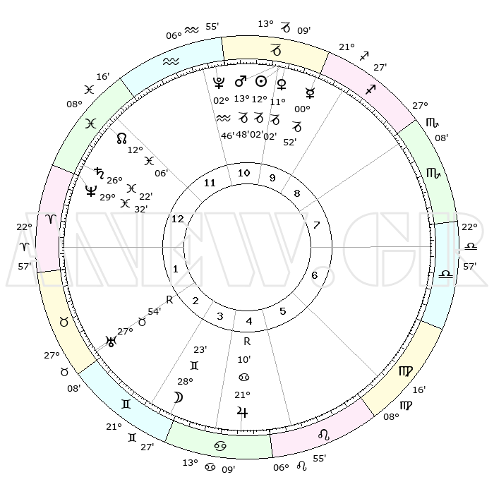 | | ΘΕΣΕΙΣ ΠΛΑΝΗΤΩΝ ΑΣΤΡΟΛΟΓΙΚΟΥ ΧΑΡΤΗ ΤΗΣ ΣΤΙΓΜΗΣ ΑΥΤΗΣ | | | | Πλανήτης | Ζώδιο | Μοίρες | Δεκαήμ. | Σε οίκο | Απόκλιση | | Ακμές των οίκων | | Ηλιος | Αιγόκερως | 11°58' | Δεύτερο | 11 | 22 S 54 | | 1ος | 10°35' | Ιχθείς | | Σελήνη | Δίδυμοι | 27°18' | Τρίτο | 4 | 28 N 16 | | 2ος | 24°47' | Κριός | | Ερμής | Αιγόκερως | 00°45' | Πρώτο | 10 | 24 S 09 | | 3ος | 25°28' | Ταύρος | | Αφροδίτη | Αιγόκερως | 10°56' | Δεύτερο | 11 | 23 S 32 | | 4ος | 18°56' | Δίδυμοι | | Αρης | Αιγόκερως | 13°45' | Δεύτερο | 11 | 23 S 37 | | 5ος | 10°41' | Καρκίνος | | Δίας | Καρκίνος | 21°10'R | Τρίτο | 5 | 22 N 00 | | 6ος | 05°25' | Λέων | | Κρόνος | Ιχθείς | 26°22' | Τρίτο | 1 | 03 S 31 | | 7ος | 10°35' | Παρθένος | | Ουρανός | Ταύρος | 27°54'R | Τρίτο | 3 | 19 N 30 | | 8ος | 24°47' | Ζυγός | | Ποσειδώνας | Ιχθείς | 29°32' | Τρίτο | 1 | 01 S 25 | | 9ος | 25°28' | Σκορπιός | | Πλούτωνας | Υδροχόος | 02°46' | Πρώτο | 11 | 23 S 13 | | 10ος | 18°56' | Τοξότης | | Β. Δεσμός | Ιχθείς | 12°06' | Δεύτερο | 1 | 07 S 01 | | 11ος | 10°41' | Αιγόκερως | | Ωροσκόπος | Ιχθείς | 10°35' | Δεύτερο | | | 12ος | 05°25' | Υδροχόος | | Μεσουράνημα | Τοξότης | 18°56' | Δεύτερο | | | |