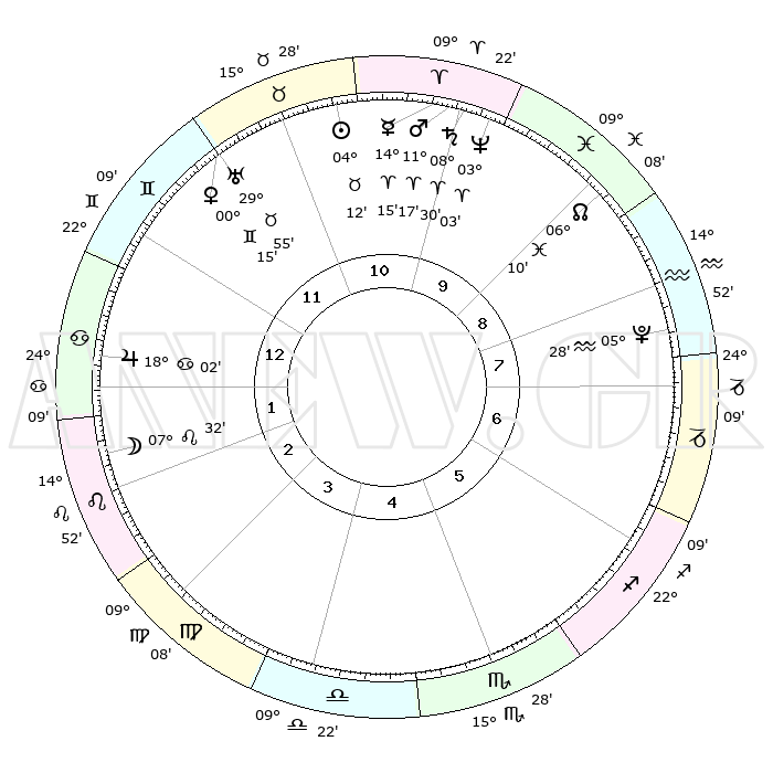 | | ΘΕΣΕΙΣ ΠΛΑΝΗΤΩΝ ΑΣΤΡΟΛΟΓΙΚΟΥ ΧΑΡΤΗ ΤΗΣ ΣΤΙΓΜΗΣ ΑΥΤΗΣ | | | | Πλανήτης | Ζώδιο | Μοίρες | Δεκαήμ. | Σε οίκο | Απόκλιση | | Ακμές των οίκων | | Ηλιος | Ταύρος | 04°09' | Πρώτο | 11 | 12 N 54 | | 1ος | 06°20' | Καρκίνος | | Σελήνη | Λέων | 06°44' | Πρώτο | 2 | 21 N 06 | | 2ος | 26°50' | Καρκίνος | | Ερμής | Κριός | 14°09' | Δεύτερο | 10 | 03 N 18 | | 3ος | 19°07' | Λέων | | Αφροδίτη | Δίδυμοι | 00°11' | Πρώτο | 11 | 20 N 46 | | 4ος | 16°29' | Παρθένος | | Αρης | Κριός | 11°14' | Δεύτερο | 10 | 03 N 35 | | 5ος | 21°20' | Ζυγός | | Δίας | Καρκίνος | 18°02' | Δεύτερο | 1 | 22 N 36 | | 6ος | 00°44' | Τοξότης | | Κρόνος | Κριός | 08°30' | Πρώτο | 10 | 01 N 23 | | 7ος | 06°20' | Αιγόκερως | | Ουρανός | Ταύρος | 29°55' | Τρίτο | 11 | 19 N 58 | | 8ος | 26°50' | Αιγόκερως | | Ποσειδώνας | Κριός | 03°03' | Πρώτο | 10 | 00 N 00 | | 9ος | 19°07' | Υδροχόος | | Πλούτωνας | Υδροχόος | 05°28' | Πρώτο | 8 | 22 S 48 | | 10ος | 16°29' | Ιχθείς | | Β. Δεσμός | Ιχθείς | 06°10' | Πρώτο | 9 | 09 S 15 | | 11ος | 21°20' | Κριός | | Ωροσκόπος | Καρκίνος | 06°20' | Πρώτο | | | 12ος | 00°44' | Δίδυμοι | | Μεσουράνημα | Ιχθείς | 16°29' | Δεύτερο | | | |