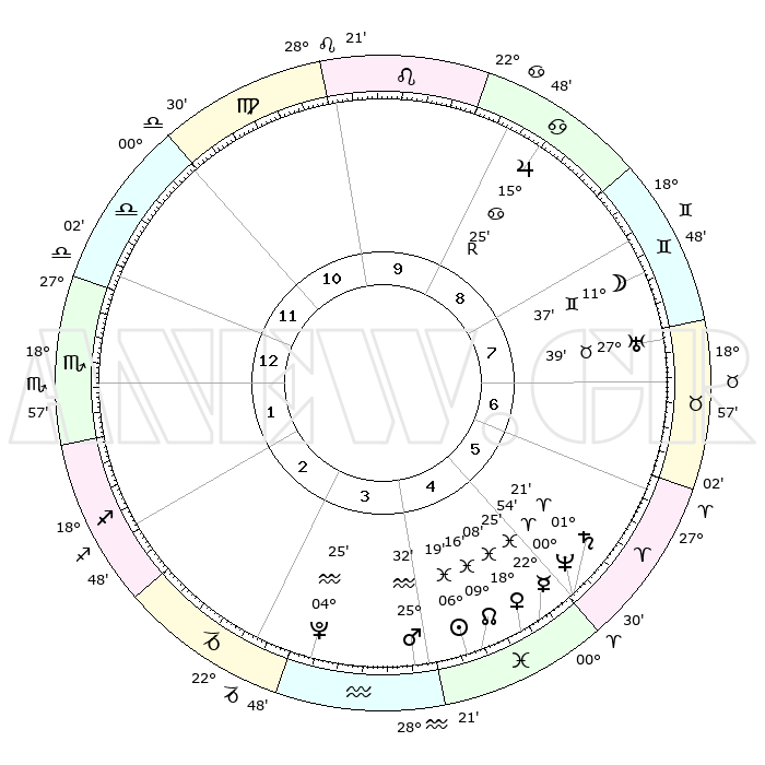| | ΘΕΣΕΙΣ ΠΛΑΝΗΤΩΝ ΑΣΤΡΟΛΟΓΙΚΟΥ ΧΑΡΤΗ ΤΗΣ ΣΤΙΓΜΗΣ ΑΥΤΗΣ | | | | Πλανήτης | Ζώδιο | Μοίρες | Δεκαήμ. | Σε οίκο | Απόκλιση | | Ακμές των οίκων | | Ηλιος | Ιχθείς | 06°15' | Πρώτο | 4 | 09 S 13 | | 1ος | 02°16' | Σκορπιός | | Σελήνη | Δίδυμοι | 10°48' | Δεύτερο | 8 | 27 N 17 | | 2ος | 00°49' | Τοξότης | | Ερμής | Ιχθείς | 22°24' | Τρίτο | 5 | 00 S 45 | | 3ος | 02°57' | Αιγόκερως | | Αφροδίτη | Ιχθείς | 18°04' | Δεύτερο | 5 | 06 S 01 | | 4ος | 07°18' | Υδροχόος | | Αρης | Υδροχόος | 25°30' | Τρίτο | 4 | 14 S 03 | | 5ος | 10°11' | Ιχθείς | | Δίας | Καρκίνος | 15°25'R | Δεύτερο | 9 | 22 N 53 | | 6ος | 08°39' | Κριός | | Κρόνος | Κριός | 01°21' | Πρώτο | 5 | 01 S 25 | | 7ος | 02°16' | Ταύρος | | Ουρανός | Ταύρος | 27°39' | Τρίτο | 7 | 19 N 27 | | 8ος | 00°49' | Δίδυμοι | | Ποσειδώνας | Κριός | 00°54' | Πρώτο | 5 | 00 S 50 | | 9ος | 02°57' | Καρκίνος | | Πλούτωνας | Υδροχόος | 04°25' | Πρώτο | 3 | 22 S 54 | | 10ος | 07°18' | Λέων | | Β. Δεσμός | Ιχθείς | 09°16' | Πρώτο | 4 | 08 S 06 | | 11ος | 10°11' | Παρθένος | | Ωροσκόπος | Σκορπιός | 02°16' | Πρώτο | | | 12ος | 08°39' | Ζυγός | | Μεσουράνημα | Λέων | 07°18' | Πρώτο | | | |