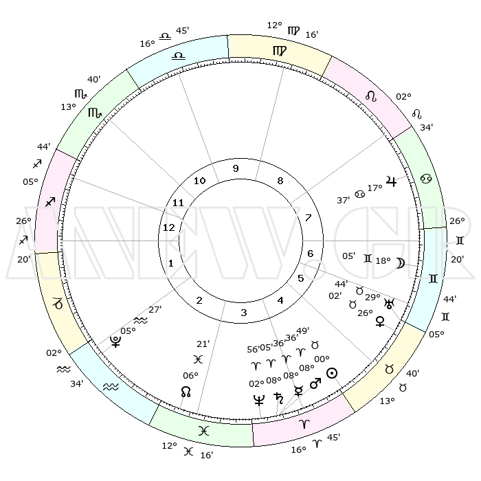 | | ΘΕΣΕΙΣ ΠΛΑΝΗΤΩΝ ΑΣΤΡΟΛΟΓΙΚΟΥ ΧΑΡΤΗ ΤΗΣ ΣΤΙΓΜΗΣ ΑΥΤΗΣ | | | | Πλανήτης | Ζώδιο | Μοίρες | Δεκαήμ. | Σε οίκο | Απόκλιση | | Ακμές των οίκων | | Ηλιος | Ταύρος | 00°45' | Πρώτο | 5 | 11 N 44 | | 1ος | 06°27' | Τοξότης | | Σελήνη | Δίδυμοι | 17°08' | Δεύτερο | 7 | 27 N 49 | | 2ος | 08°33' | Αιγόκερως | | Ερμής | Κριός | 08°30' | Πρώτο | 4 | 00 N 59 | | 3ος | 15°21' | Υδροχόος | | Αφροδίτη | Ταύρος | 25°57' | Τρίτο | 6 | 19 N 40 | | 4ος | 21°26' | Ιχθείς | | Αρης | Κριός | 08°33' | Πρώτο | 4 | 02 N 31 | | 5ος | 21°35' | Κριός | | Δίας | Καρκίνος | 17°37' | Δεύτερο | 8 | 22 N 39 | | 6ος | 15°46' | Ταύρος | | Κρόνος | Κριός | 08°05' | Πρώτο | 4 | 01 N 14 | | 7ος | 06°27' | Δίδυμοι | | Ουρανός | Ταύρος | 29°44' | Τρίτο | 6 | 19 N 55 | | 8ος | 08°33' | Καρκίνος | | Ποσειδώνας | Κριός | 02°56' | Πρώτο | 4 | 00 S 03 | | 9ος | 15°21' | Λέων | | Πλούτωνας | Υδροχόος | 05°27' | Πρώτο | 2 | 22 S 48 | | 10ος | 21°26' | Παρθένος | | Β. Δεσμός | Ιχθείς | 06°21' | Πρώτο | 3 | 09 S 11 | | 11ος | 21°35' | Ζυγός | | Ωροσκόπος | Τοξότης | 06°27' | Πρώτο | | | 12ος | 15°47' | Σκορπιός | | Μεσουράνημα | Παρθένος | 21°26' | Τρίτο | | | |