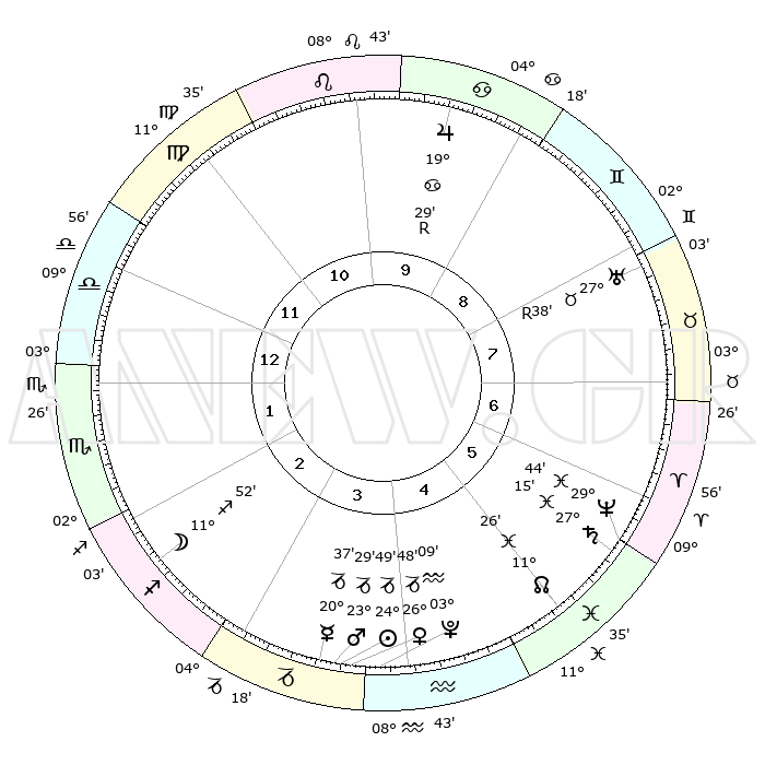 | | ΘΕΣΕΙΣ ΠΛΑΝΗΤΩΝ ΑΣΤΡΟΛΟΓΙΚΟΥ ΧΑΡΤΗ ΤΗΣ ΣΤΙΓΜΗΣ ΑΥΤΗΣ | | | | Πλανήτης | Ζώδιο | Μοίρες | Δεκαήμ. | Σε οίκο | Απόκλιση | | Ακμές των οίκων | | Ηλιος | Αιγόκερως | 24°45' | Τρίτο | 4 | 21 S 10 | | 1ος | 11°42' | Ζυγός | | Σελήνη | Τοξότης | 10°59' | Δεύτερο | 3 | 27 S 09 | | 2ος | 09°03' | Σκορπιός | | Ερμής | Αιγόκερως | 20°30' | Τρίτο | 4 | 23 S 38 | | 3ος | 09°57' | Τοξότης | | Αφροδίτη | Αιγόκερως | 26°43' | Τρίτο | 4 | 21 S 46 | | 4ος | 13°11' | Αιγόκερως | | Αρης | Αιγόκερως | 23°25' | Τρίτο | 4 | 22 S 21 | | 5ος | 16°07' | Υδροχόος | | Δίας | Καρκίνος | 19°29'R | Δεύτερο | 10 | 22 N 17 | | 6ος | 16°03' | Ιχθείς | | Κρόνος | Ιχθείς | 27°14' | Τρίτο | 6 | 03 S 08 | | 7ος | 11°42' | Κριός | | Ουρανός | Ταύρος | 27°38'R | Τρίτο | 8 | 19 N 26 | | 8ος | 09°03' | Ταύρος | | Ποσειδώνας | Ιχθείς | 29°44' | Τρίτο | 6 | 01 S 19 | | 9ος | 09°57' | Δίδυμοι | | Πλούτωνας | Υδροχόος | 03°09' | Πρώτο | 4 | 23 S 08 | | 10ος | 13°11' | Καρκίνος | | Β. Δεσμός | Ιχθείς | 11°26' | Δεύτερο | 5 | 07 S 17 | | 11ος | 16°07' | Λέων | | Ωροσκόπος | Ζυγός | 11°42' | Δεύτερο | | | 12ος | 16°03' | Παρθένος | | Μεσουράνημα | Καρκίνος | 13°11' | Δεύτερο | | | |