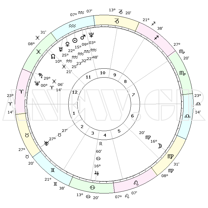| | ΘΕΣΕΙΣ ΠΛΑΝΗΤΩΝ ΑΣΤΡΟΛΟΓΙΚΟΥ ΧΑΡΤΗ ΤΗΣ ΣΤΙΓΜΗΣ ΑΥΤΗΣ | | | | Πλανήτης | Ζώδιο | Μοίρες | Δεκαήμ. | Σε οίκο | Απόκλιση | | Ακμές των οίκων | | Ηλιος | Υδροχόος | 15°27' | Δεύτερο | 12 | 16 S 12 | | 1ος | 10°05' | Ιχθείς | | Σελήνη | Παρθένος | 15°21' | Δεύτερο | 7 | 05 N 14 | | 2ος | 24°21' | Κριός | | Ερμής | Υδροχόος | 25°17' | Τρίτο | 12 | 14 S 37 | | 3ος | 25°08' | Ταύρος | | Αφροδίτη | Υδροχόος | 22°18' | Τρίτο | 12 | 15 S 24 | | 4ος | 18°39' | Δίδυμοι | | Αρης | Υδροχόος | 09°18' | Πρώτο | 12 | 18 S 56 | | 5ος | 10°23' | Καρκίνος | | Δίας | Καρκίνος | 17°00'R | Δεύτερο | 5 | 22 N 40 | | 6ος | 05°04' | Λέων | | Κρόνος | Ιχθείς | 29°05' | Τρίτο | 1 | 02 S 21 | | 7ος | 10°05' | Παρθένος | | Ουρανός | Ταύρος | 27°27' | Τρίτο | 3 | 19 N 24 | | 8ος | 24°21' | Ζυγός | | Ποσειδώνας | Κριός | 00°14' | Πρώτο | 1 | 01 S 07 | | 9ος | 25°08' | Σκορπιός | | Πλούτωνας | Υδροχόος | 03°48' | Πρώτο | 11 | 23 S 00 | | 10ος | 18°39' | Τοξότης | | Β. Δεσμός | Ιχθείς | 10°21' | Δεύτερο | 1 | 07 S 41 | | 11ος | 10°23' | Αιγόκερως | | Ωροσκόπος | Ιχθείς | 10°05' | Δεύτερο | | | 12ος | 05°04' | Υδροχόος | | Μεσουράνημα | Τοξότης | 18°39' | Δεύτερο | | | |