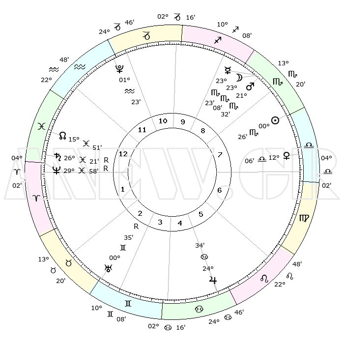 | ΘΕΣΕΙΣ ΠΛΑΝΗΤΩΝ ΑΣΤΡΟΛΟΓΙΚΟΥ ΧΑΡΤΗ ΤΗΣ ΣΤΙΓΜΗΣ ΑΥΤΗΣ | | Πλανήτης | Ζώδιο | Μοίρες | Δεκαήμ. | Σε οίκο | Απόκλιση | | Ακμές των οίκων | Ηλιος | Σκορπιός | 00°18' | Πρώτο | 9 | 11 S 34 | | 1ος | 20°24' | Αιγόκερως | Σελήνη | Σκορπιός | 21°25' | Τρίτο | 10 | 22 S 34 | | 2ος | 02°38' | Ιχθείς | Ερμής | Σκορπιός | 23°12' | Τρίτο | 10 | 21 S 00 | | 3ος | 12°19' | Κριός | Αφροδίτη | Ζυγός | 11°55' | Δεύτερο | 8 | 03 S 18 | | 4ος | 12°31' | Ταύρος | Αρης | Σκορπιός | 21°25' | Τρίτο | 10 | 18 S 25 | | 5ος | 06°08' | Δίδυμοι | Δίας | Καρκίνος | 24°33' | Τρίτο | 7 | 21 N 16 | | 6ος | 27°20' | Δίδυμοι | Κρόνος | Ιχθείς | 26°22'R | Τρίτο | 2 | 03 S 44 | | 7ος | 20°24' | Καρκίνος | Ουρανός | Δίδυμοι | 00°35'R | Πρώτο | 4 | 20 N 04 | | 8ος | 02°38' | Παρθένος | Ποσειδώνας | Ιχθείς | 29°58'R | Τρίτο | 2 | 01 S 16 | | 9ος | 12°19' | Ζυγός | Πλούτωνας | Υδροχόος | 01°23' | Πρώτο | 1 | 23 S 32 | | 10ος | 12°31' | Σκορπιός | Β. Δεσμός | Ιχθείς | 15°51' | Δεύτερο | 2 | 05 S 35 | | 11ος | 06°08' | Τοξότης | Ωροσκόπος | Αιγόκερως | 20°24' | Τρίτο | | | 12ος | 27°20' | Τοξότης | Μεσουράνημα | Σκορπιός | 12°31' | Δεύτερο | | | |