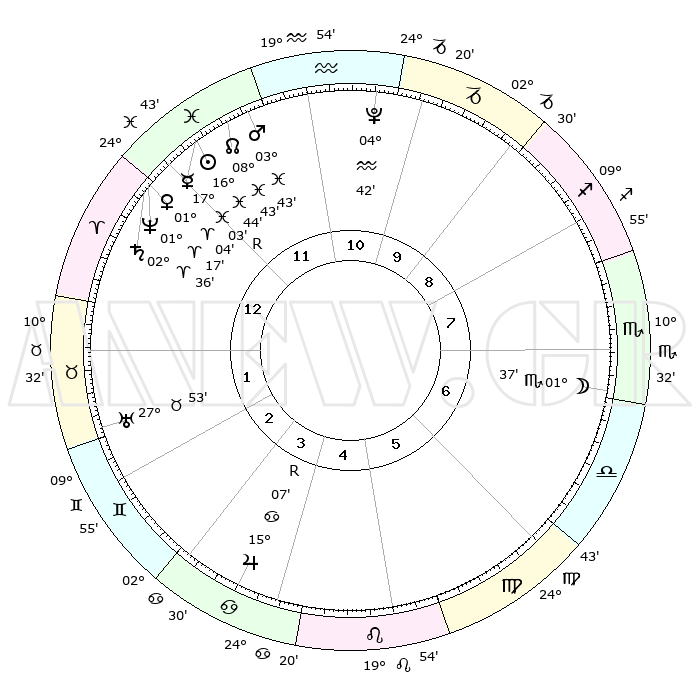 | | ΘΕΣΕΙΣ ΠΛΑΝΗΤΩΝ ΑΣΤΡΟΛΟΓΙΚΟΥ ΧΑΡΤΗ ΤΗΣ ΣΤΙΓΜΗΣ ΑΥΤΗΣ | | | | Πλανήτης | Ζώδιο | Μοίρες | Δεκαήμ. | Σε οίκο | Απόκλιση | | Ακμές των οίκων | | Ηλιος | Ιχθείς | 16°39' | Δεύτερο | 12 | 05 S 16 | | 1ος | 24°07' | Ιχθείς | | Σελήνη | Σκορπιός | 00°36' | Πρώτο | 7 | 15 S 33 | | 2ος | 05°46' | Ταύρος | | Ερμής | Ιχθείς | 17°08'R | Δεύτερο | 12 | 01 S 43 | | 3ος | 04°06' | Δίδυμοι | | Αφροδίτη | Κριός | 00°58' | Πρώτο | 1 | 00 S 45 | | 4ος | 26°42' | Δίδυμοι | | Αρης | Ιχθείς | 03°39' | Πρώτο | 12 | 11 S 11 | | 5ος | 18°46' | Καρκίνος | | Δίας | Καρκίνος | 15°07'R | Δεύτερο | 4 | 22 N 56 | | 6ος | 15°18' | Λέων | | Κρόνος | Κριός | 02°35' | Πρώτο | 1 | 00 S 55 | | 7ος | 24°07' | Παρθένος | | Ουρανός | Ταύρος | 27°53' | Τρίτο | 2 | 19 N 31 | | 8ος | 05°47' | Σκορπιός | | Ποσειδώνας | Κριός | 01°17' | Πρώτο | 1 | 00 S 41 | | 9ος | 04°06' | Τοξότης | | Πλούτωνας | Υδροχόος | 04°42' | Πρώτο | 11 | 22 S 51 | | 10ος | 26°42' | Τοξότης | | Β. Δεσμός | Ιχθείς | 08°43' | Πρώτο | 12 | 08 S 18 | | 11ος | 18°46' | Αιγόκερως | | Ωροσκόπος | Ιχθείς | 24°07' | Τρίτο | | | 12ος | 15°18' | Υδροχόος | | Μεσουράνημα | Τοξότης | 26°42' | Τρίτο | | | |