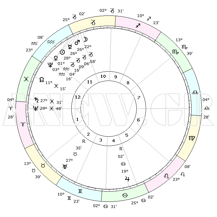 | | ΘΕΣΕΙΣ ΠΛΑΝΗΤΩΝ ΑΣΤΡΟΛΟΓΙΚΟΥ ΧΑΡΤΗ ΤΗΣ ΣΤΙΓΜΗΣ ΑΥΤΗΣ | | | | Πλανήτης | Ζώδιο | Μοίρες | Δεκαήμ. | Σε οίκο | Απόκλιση | | Ακμές των οίκων | | Ηλιος | Αιγόκερως | 28°12' | Τρίτο | 12 | 20 S 31 | | 1ος | 00°32' | Ιχθείς | | Σελήνη | Αιγόκερως | 22°14' | Τρίτο | 11 | 25 S 20 | | 2ος | 15°55' | Κριός | | Ερμής | Αιγόκερως | 26°03' | Τρίτο | 11 | 22 S 51 | | 3ος | 18°31' | Ταύρος | | Αφροδίτη | Υδροχόος | 00°59' | Πρώτο | 12 | 20 S 59 | | 4ος | 12°52' | Δίδυμοι | | Αρης | Αιγόκερως | 26°03' | Τρίτο | 11 | 21 S 54 | | 5ος | 04°33' | Καρκίνος | | Δίας | Καρκίνος | 19°02'R | Δεύτερο | 5 | 22 N 21 | | 6ος | 28°10' | Καρκίνος | | Κρόνος | Ιχθείς | 27°31' | Τρίτο | 1 | 03 S 01 | | 7ος | 00°32' | Παρθένος | | Ουρανός | Ταύρος | 27°35'R | Τρίτο | 3 | 19 N 26 | | 8ος | 15°55' | Ζυγός | | Ποσειδώνας | Ιχθείς | 29°48' | Τρίτο | 1 | 01 S 17 | | 9ος | 18°31' | Σκορπιός | | Πλούτωνας | Υδροχόος | 03°16' | Πρώτο | 12 | 23 S 06 | | 10ος | 12°52' | Τοξότης | | Β. Δεσμός | Ιχθείς | 11°15' | Δεύτερο | 1 | 07 S 21 | | 11ος | 04°33' | Αιγόκερως | | Ωροσκόπος | Ιχθείς | 00°32' | Πρώτο | | | 12ος | 28°10' | Αιγόκερως | | Μεσουράνημα | Τοξότης | 12°52' | Δεύτερο | | | |
