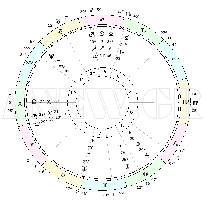 | | ΘΕΣΕΙΣ ΠΛΑΝΗΤΩΝ ΑΣΤΡΟΛΟΓΙΚΟΥ ΧΑΡΤΗ ΤΗΣ ΣΤΙΓΜΗΣ ΑΥΤΗΣ | | | | Πλανήτης | Ζώδιο | Μοίρες | Δεκαήμ. | Σε οίκο | Απόκλιση | | Ακμές των οίκων | | Ηλιος | Τοξότης | 14°29' | Δεύτερο | 10 | 22 S 32 | | 1ος | 04°33' | Υδροχόος | | Σελήνη | Καρκίνος | 04°21' | Πρώτο | 5 | 28 N 02 | | 2ος | 19°19' | Ιχθείς | | Ερμής | Σκορπιός | 23°59' | Τρίτο | 9 | 16 S 23 | | 3ος | 27°01' | Κριός | | Αφροδίτη | Τοξότης | 06°58' | Πρώτο | 10 | 20 S 58 | | 4ος | 24°43' | Ταύρος | | Αρης | Τοξότης | 23°18' | Τρίτο | 11 | 23 S 58 | | 5ος | 17°10' | Δίδυμοι | | Δίας | Καρκίνος | 24°09'R | Τρίτο | 6 | 21 N 27 | | 6ος | 08°47' | Καρκίνος | | Κρόνος | Ιχθείς | 25°20' | Τρίτο | 2 | 04 S 00 | | 7ος | 04°33' | Λέων | | Ουρανός | Ταύρος | 28°50'R | Τρίτο | 4 | 19 N 42 | | 8ος | 19°19' | Παρθένος | | Ποσειδώνας | Ιχθείς | 29°23'R | Τρίτο | 2 | 01 S 29 | | 9ος | 27°01' | Ζυγός | | Πλούτωνας | Υδροχόος | 02°02' | Πρώτο | 12 | 23 S 22 | | 10ος | 24°43' | Σκορπιός | | Β. Δεσμός | Ιχθείς | 13°32' | Δεύτερο | 1 | 06 S 29 | | 11ος | 17°10' | Τοξότης | | Ωροσκόπος | Υδροχόος | 04°33' | Πρώτο | | | 12ος | 08°47' | Αιγόκερως | | Μεσουράνημα | Σκορπιός | 24°43' | Τρίτο | | | |
