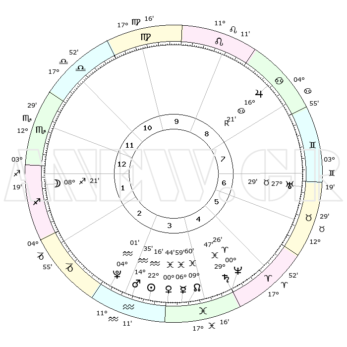 | | ΘΕΣΕΙΣ ΠΛΑΝΗΤΩΝ ΑΣΤΡΟΛΟΓΙΚΟΥ ΧΑΡΤΗ ΤΗΣ ΣΤΙΓΜΗΣ ΑΥΤΗΣ | | | | Πλανήτης | Ζώδιο | Μοίρες | Δεκαήμ. | Σε οίκο | Απόκλιση | | Ακμές των οίκων | | Ηλιος | Υδροχόος | 22°13' | Τρίτο | 3 | 14 S 06 | | 1ος | 15°32' | Σκορπιός | | Σελήνη | Τοξότης | 07°37' | Πρώτο | 1 | 26 S 45 | | 2ος | 15°03' | Τοξότης | | Ερμής | Ιχθείς | 06°53' | Πρώτο | 4 | 09 S 40 | | 3ος | 18°36' | Αιγόκερως | | Αφροδίτη | Ιχθείς | 00°40' | Πρώτο | 4 | 12 S 36 | | 4ος | 23°55' | Υδροχόος | | Αρης | Υδροχόος | 14°32' | Δεύτερο | 3 | 17 S 29 | | 5ος | 26°18' | Ιχθείς | | Δίας | Καρκίνος | 16°22'R | Δεύτερο | 8 | 22 N 45 | | 6ος | 23°17' | Κριός | | Κρόνος | Ιχθείς | 29°47' | Τρίτο | 5 | 02 S 04 | | 7ος | 15°32' | Ταύρος | | Ουρανός | Ταύρος | 27°29' | Τρίτο | 7 | 19 N 25 | | 8ος | 15°03' | Δίδυμοι | | Ποσειδώνας | Κριός | 00°26' | Πρώτο | 5 | 01 S 02 | | 9ος | 18°36' | Καρκίνος | | Πλούτωνας | Υδροχόος | 04°01' | Πρώτο | 3 | 22 S 58 | | 10ος | 23°55' | Λέων | | Β. Δεσμός | Ιχθείς | 10°00' | Δεύτερο | 4 | 07 S 49 | | 11ος | 26°18' | Παρθένος | | Ωροσκόπος | Σκορπιός | 15°32' | Δεύτερο | | | 12ος | 23°17' | Ζυγός | | Μεσουράνημα | Λέων | 23°55' | Τρίτο | | | |